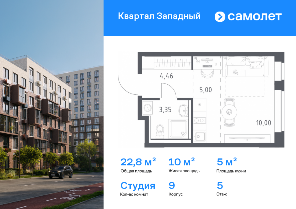 Строим кварталы для жизни с заботой о будущем. Предлагается квартира студия комфорт-класса 22,81 кв.м в корпусе 9 на 5 этаже, в ЖК «Квартал Западный» Квартира с чистовой отделкой. Доступность дополнительных опций уточняйте у застройщика. Приобрести квартиру возможно по специальным акциям от застройщика, с текущими условиями акций можно ознакомиться в блоке «Акций». Цена динамическая и может отличаться, уточняйте актуальность у застройщика. Жилой комплекс в окружении лесопарков и рядом с рекой. До станции МЦД-4 «Санино» можно дойти пешком за 7 минут, а на территории проекта появится транспортно-пересадочный узел с торговым центром. Для жителей построят школу, 2 детсада, в одном из которых будут развивающие кабинеты-трансформеры. Дворы — тихое зеленое пространство без машин. В проекте появится собственный ландшафтный парк с благоустроенной набережной и центральная площадь, на которой будут проводиться различные мероприятия. Высота домов — от 5 до 15 этажей. Фасады выполняют в естественных оттенках, в соответствии с дизайн-кодом «Полевой луг». У каждой секции — свое цветовое решение. Белый цвет верхних этажей добавляет застройке легкости. Фасады облицованы клинкерным глазурованным кирпичом, который используют в проектах бизнес-класса.