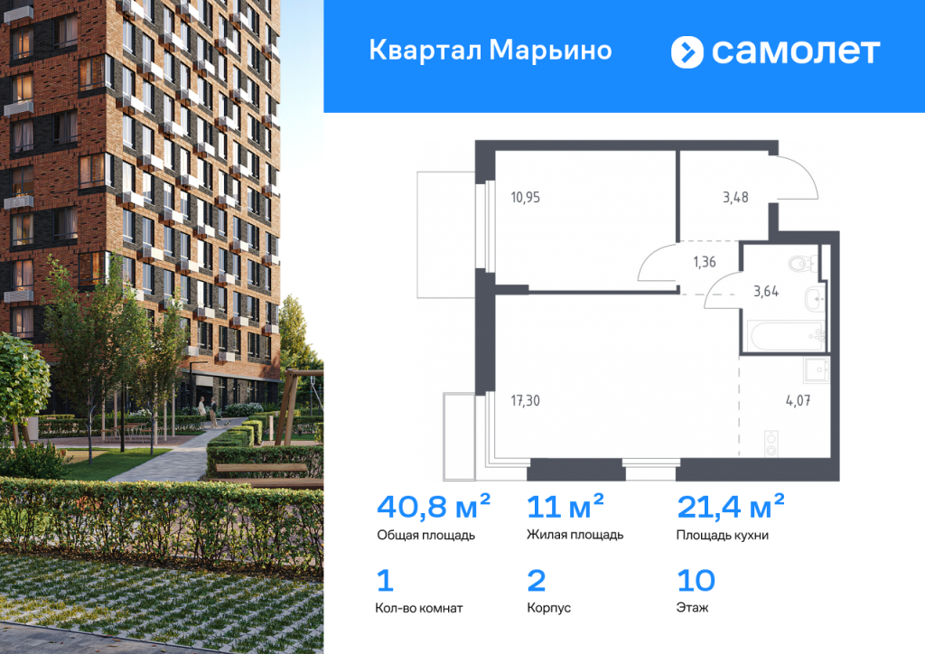 Строим кварталы для жизни с заботой о будущем. Предлагается 1-комнатная квартира комфорт-класса 40,8 кв.м в корпусе 2 на 10 этаже, в ЖК «Квартал Марьино» Квартира без отделки. Доступность опции «отделка» и возможность комплектации мебелью и декором уточняйте у застройщика. Приобрести квартиру возможно по специальным акциям от застройщика, с текущими условиями акций можно ознакомиться в блоке «Акций». Цена динамическая и может отличаться, уточняйте актуальность у застройщика. «Квартал Марьино» — проект в Новой Москве, в 18 км от МКАД, вблизи Валуевского лесопарка. Здесь будет все, чтобы получать удовольствие от жизни: приватные дворы-парки без машин, инфраструктура в шаговой доступности и общественные пространства для разнообразных занятий на свежем воздухе. До станции метро «Филатов луг» — 15 минут на машине по Филимонковскому шоссе. Живописные места для отдыха на природе — на расстоянии 2-5 км от дома. На территории будут построены 6 детских садов, 4 школы, поликлиника и спортивный комплекс, а также кафе, магазины и салоны красоты на первых этажах жилых домов. В закрытых дворах-парках предусмотрены игровые площадки, лужайки для пикников и йоги. Пространства для спокойного отдыха будут огорожены живыми изгородями. Дизайн-код проекта — «Полевые цветы». Он прослеживается в каждой детали — от натуральных оттенков фасадов до элементов благоустройства в эко-стиле.