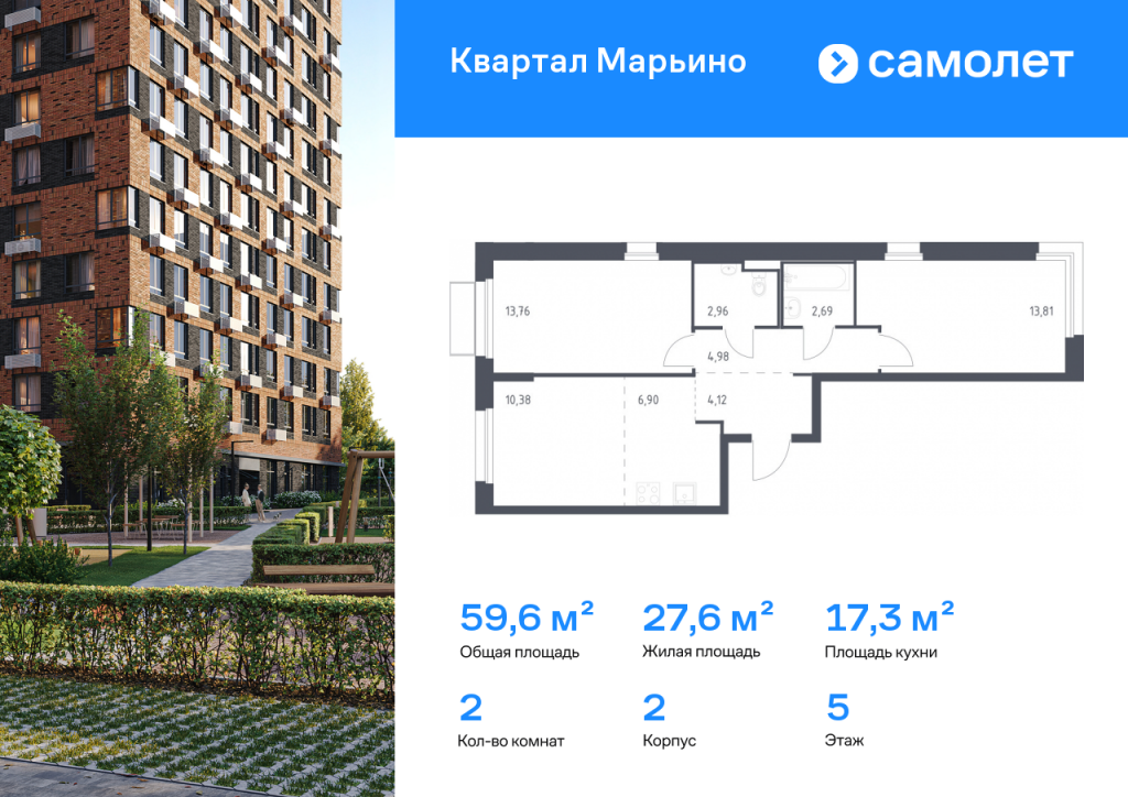 Строим кварталы для жизни с заботой о будущем. Предлагается 2-комнатная квартира комфорт-класса 59,6 кв.м в корпусе 2 на 5 этаже, в ЖК «Квартал Марьино» Квартира с чистовой отделкой. Доступность дополнительных опций уточняйте у застройщика. Приобрести квартиру возможно по специальным акциям от застройщика, с текущими условиями акций можно ознакомиться в блоке «Акций». Цена динамическая и может отличаться, уточняйте актуальность у застройщика. «Квартал Марьино» — проект в Новой Москве, в 18 км от МКАД, вблизи Валуевского лесопарка. Здесь будет все, чтобы получать удовольствие от жизни: приватные дворы-парки без машин, инфраструктура в шаговой доступности и общественные пространства для разнообразных занятий на свежем воздухе. До станции метро «Филатов луг» — 15 минут на машине по Филимонковскому шоссе. Живописные места для отдыха на природе — на расстоянии 2-5 км от дома. На территории будут построены 6 детских садов, 4 школы, поликлиника и спортивный комплекс, а также кафе, магазины и салоны красоты на первых этажах жилых домов. В закрытых дворах-парках предусмотрены игровые площадки, лужайки для пикников и йоги. Пространства для спокойного отдыха будут огорожены живыми изгородями. Дизайн-код проекта — «Полевые цветы». Он прослеживается в каждой детали — от натуральных оттенков фасадов до элементов благоустройства в эко-стиле.