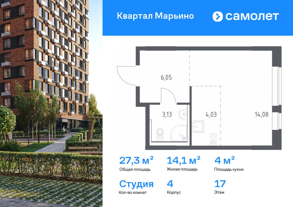 Строим кварталы для жизни с заботой о будущем. Предлагается квартира студия комфорт-класса 27,29 кв.м в корпусе 4 на 17 этаже, в ЖК «Квартал Марьино» Квартира без отделки. Доступность опции «отделка» и возможность комплектации мебелью и декором уточняйте у застройщика. Приобрести квартиру возможно по специальным акциям от застройщика, с текущими условиями акций можно ознакомиться в блоке «Акций». Цена динамическая и может отличаться, уточняйте актуальность у застройщика. «Квартал Марьино» — проект в Новой Москве, в 18 км от МКАД, вблизи Валуевского лесопарка. Здесь будет все, чтобы получать удовольствие от жизни: приватные дворы-парки без машин, инфраструктура в шаговой доступности и общественные пространства для разнообразных занятий на свежем воздухе. До станции метро «Филатов луг» — 15 минут на машине по Филимонковскому шоссе. Живописные места для отдыха на природе — на расстоянии 2-5 км от дома. На территории будут построены 6 детских садов, 4 школы, поликлиника и спортивный комплекс, а также кафе, магазины и салоны красоты на первых этажах жилых домов. В закрытых дворах-парках предусмотрены игровые площадки, лужайки для пикников и йоги. Пространства для спокойного отдыха будут огорожены живыми изгородями. Дизайн-код проекта — «Полевые цветы». Он прослеживается в каждой детали — от натуральных оттенков фасадов до элементов благоустройства в эко-стиле.
