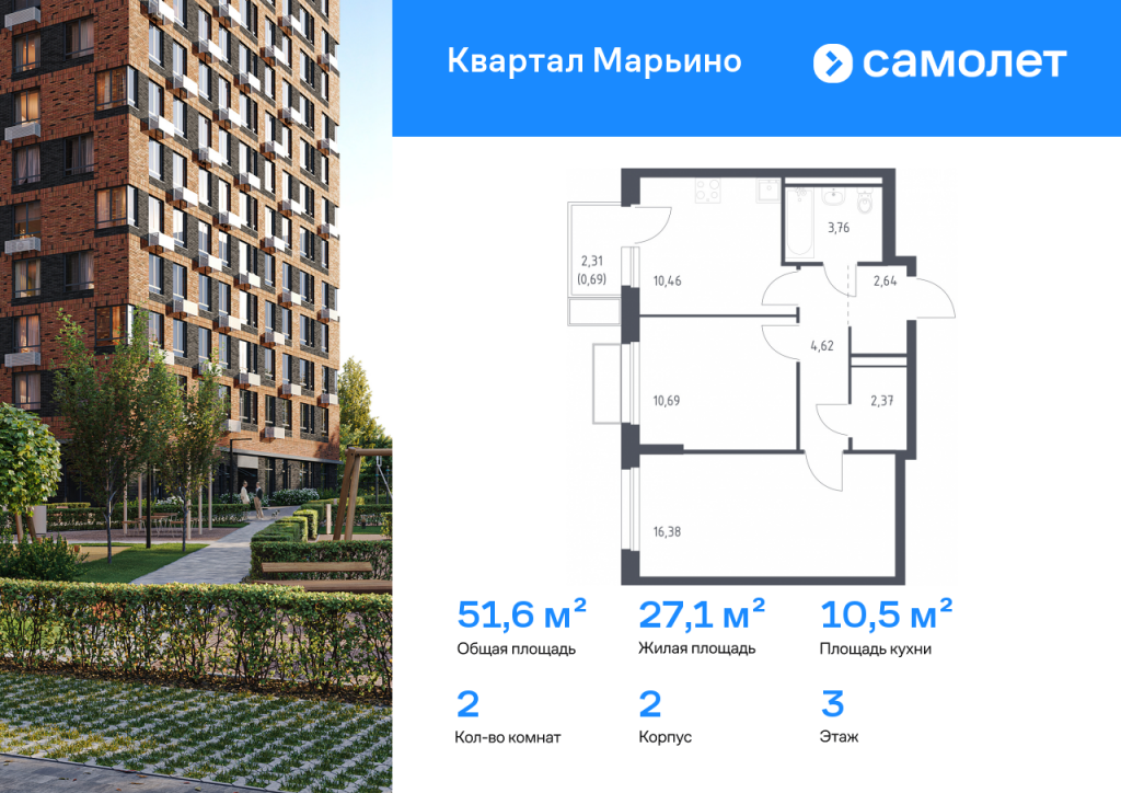 Строим кварталы для жизни с заботой о будущем. Предлагается 2-комнатная квартира комфорт-класса 51,61 кв.м в корпусе 2 на 3 этаже, в ЖК «Квартал Марьино» Квартира без отделки. Доступность опции «отделка» и возможность комплектации мебелью и декором уточняйте у застройщика. Приобрести квартиру возможно по специальным акциям от застройщика, с текущими условиями акций можно ознакомиться в блоке «Акций». Цена динамическая и может отличаться, уточняйте актуальность у застройщика. «Квартал Марьино» — проект в Новой Москве, в 18 км от МКАД, вблизи Валуевского лесопарка. Здесь будет все, чтобы получать удовольствие от жизни: приватные дворы-парки без машин, инфраструктура в шаговой доступности и общественные пространства для разнообразных занятий на свежем воздухе. До станции метро «Филатов луг» — 15 минут на машине по Филимонковскому шоссе. Живописные места для отдыха на природе — на расстоянии 2-5 км от дома. На территории будут построены 6 детских садов, 4 школы, поликлиника и спортивный комплекс, а также кафе, магазины и салоны красоты на первых этажах жилых домов. В закрытых дворах-парках предусмотрены игровые площадки, лужайки для пикников и йоги. Пространства для спокойного отдыха будут огорожены живыми изгородями. Дизайн-код проекта — «Полевые цветы». Он прослеживается в каждой детали — от натуральных оттенков фасадов до элементов благоустройства в эко-стиле.