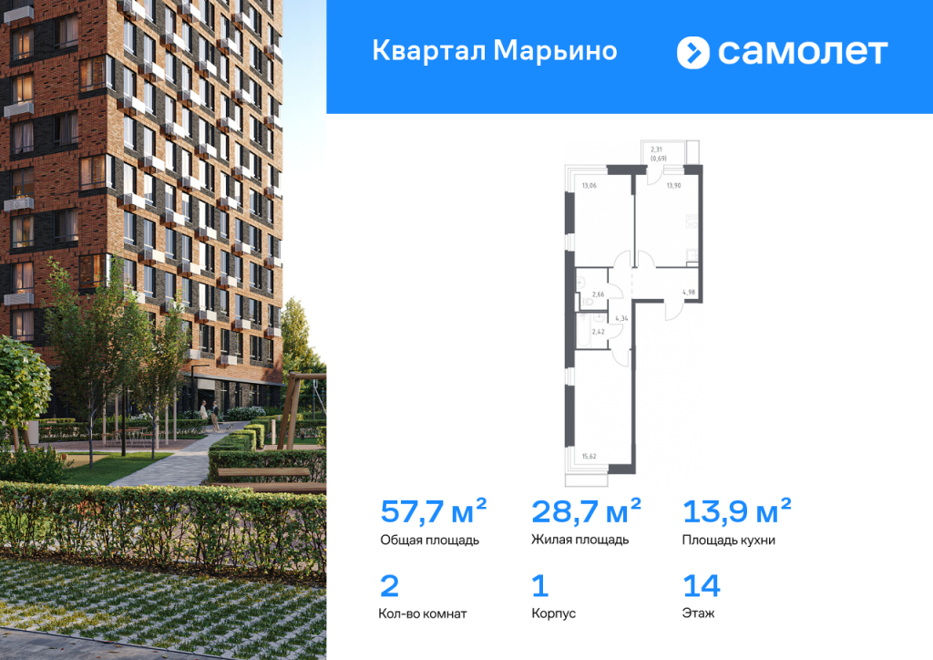 Строим кварталы для жизни с заботой о будущем. Предлагается 2-комнатная квартира комфорт-класса 57,67 кв.м в корпусе 1 на 14 этаже, в ЖК «Квартал Марьино» Квартира без отделки. Доступность опции «отделка» и возможность комплектации мебелью и декором уточняйте у застройщика. Приобрести квартиру возможно по специальным акциям от застройщика, с текущими условиями акций можно ознакомиться в блоке «Акций». Цена динамическая и может отличаться, уточняйте актуальность у застройщика. «Квартал Марьино» — проект в Новой Москве, в 18 км от МКАД, вблизи Валуевского лесопарка. Здесь будет все, чтобы получать удовольствие от жизни: приватные дворы-парки без машин, инфраструктура в шаговой доступности и общественные пространства для разнообразных занятий на свежем воздухе. До станции метро «Филатов луг» — 15 минут на машине по Филимонковскому шоссе. Живописные места для отдыха на природе — на расстоянии 2-5 км от дома. На территории будут построены 6 детских садов, 4 школы, поликлиника и спортивный комплекс, а также кафе, магазины и салоны красоты на первых этажах жилых домов. В закрытых дворах-парках предусмотрены игровые площадки, лужайки для пикников и йоги. Пространства для спокойного отдыха будут огорожены живыми изгородями. Дизайн-код проекта — «Полевые цветы». Он прослеживается в каждой детали — от натуральных оттенков фасадов до элементов благоустройства в эко-стиле.
