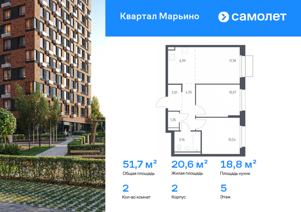 Строим кварталы для жизни с заботой о будущем. Предлагается 2-комнатная квартира комфорт-класса 51,71 кв.м в корпусе 2 на 5 этаже, в ЖК «Квартал Марьино» Квартира без отделки. Доступность опции «отделка» и возможность комплектации мебелью и декором уточняйте у застройщика. Приобрести квартиру возможно по специальным акциям от застройщика, с текущими условиями акций можно ознакомиться в блоке «Акций». Цена динамическая и может отличаться, уточняйте актуальность у застройщика. «Квартал Марьино» — проект в Новой Москве, в 18 км от МКАД, вблизи Валуевского лесопарка. Здесь будет все, чтобы получать удовольствие от жизни: приватные дворы-парки без машин, инфраструктура в шаговой доступности и общественные пространства для разнообразных занятий на свежем воздухе. До станции метро «Филатов луг» — 15 минут на машине по Филимонковскому шоссе. Живописные места для отдыха на природе — на расстоянии 2-5 км от дома. На территории будут построены 6 детских садов, 4 школы, поликлиника и спортивный комплекс, а также кафе, магазины и салоны красоты на первых этажах жилых домов. В закрытых дворах-парках предусмотрены игровые площадки, лужайки для пикников и йоги. Пространства для спокойного отдыха будут огорожены живыми изгородями. Дизайн-код проекта — «Полевые цветы». Он прослеживается в каждой детали — от натуральных оттенков фасадов до элементов благоустройства в эко-стиле.