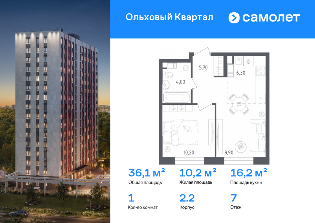 Строим кварталы для жизни с заботой о будущем. Предлагается 1-комнатная квартира комфорт-класса 36,1 кв.м в корпусе 2.2 на 7 этаже, в ЖК «Ольховый Квартал» Квартира с чистовой отделкой. Доступность дополнительных опций уточняйте у застройщика. Приобрести квартиру возможно по специальным акциям от застройщика, с текущими условиями акций можно ознакомиться в блоке «Акций». Цена динамическая и может отличаться, уточняйте актуальность у застройщика. Жилой комплекс «Ольховый Квартал» — проект комфорт-класса в Новой Москве, в пешей доступности от 3 станций метро: «Ольховая», «Прокшино» и «Коммунарка» новой Троицкой ветки. Это 3 дома высотой 16 этажей с приватными зелеными дворами. Территория квартала граничит с зеленой рощей, а через дорогу — лесопарк для ежедневных прогулок. Рядом 7 фитнес-клубов, магазины, кафе, медицинские центры, а также школы и детские сады. Пространства для тихого отдыха будут огорожены живыми изгородями. Также высадят ель, которая создаст новогоднее настроение зимой. Предусмотрены современные детские площадки для ребят всех возрастов, воркаут-зона, площадка для выгула и тренировки собак. Любители спортивных игр оценят баскетбольную площадку и столы для настольного тенниса. Светлые фасады гармонируют с окружающей природой. Облицовочный материал — фиброцементные панели. Вечером фасады украшает архитектурная подсветка.