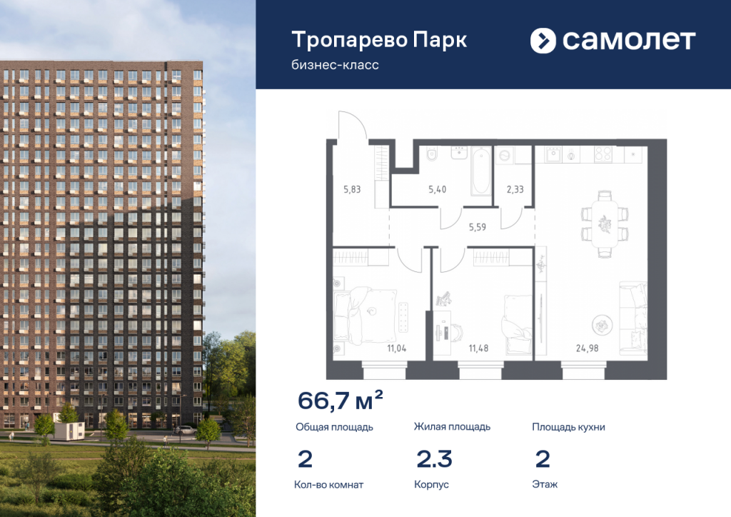 Строим кварталы для жизни с заботой о будущем. Предлагаются 2-комнатные апартаменты бизнес-класса 66,65 кв.м в корпусе 2.3 на 2 этаже, в МФК «Тропарево Парк» Апартаменты с чистовой отделкой. Доступность дополнительных опций уточняйте у застройщика. Прописка не предусмотрена в рамках юридического статуса - апартаменты. Приобрести апартаменты возможно по специальным акциям от застройщика, с текущими условиями акций можно ознакомиться в блоке «Акций». Цена динамическая и может отличаться, уточняйте актуальность у застройщика. «Тропарево Парк» — комплекс апартаментов бизнес-класса рядом с Ленинским проспектом, в Новой Москве. Находится всего в 10 минутах пешком от станции метро «Румянцево». Включает 7 жилых корпусов высотой от 16 до 23 этажей, приватные дворы-сады, обширную зеленую территорию с общественными пространствами. Из части апартаментов открываются виды на Тропаревский лесопарк, расположенный рядом.