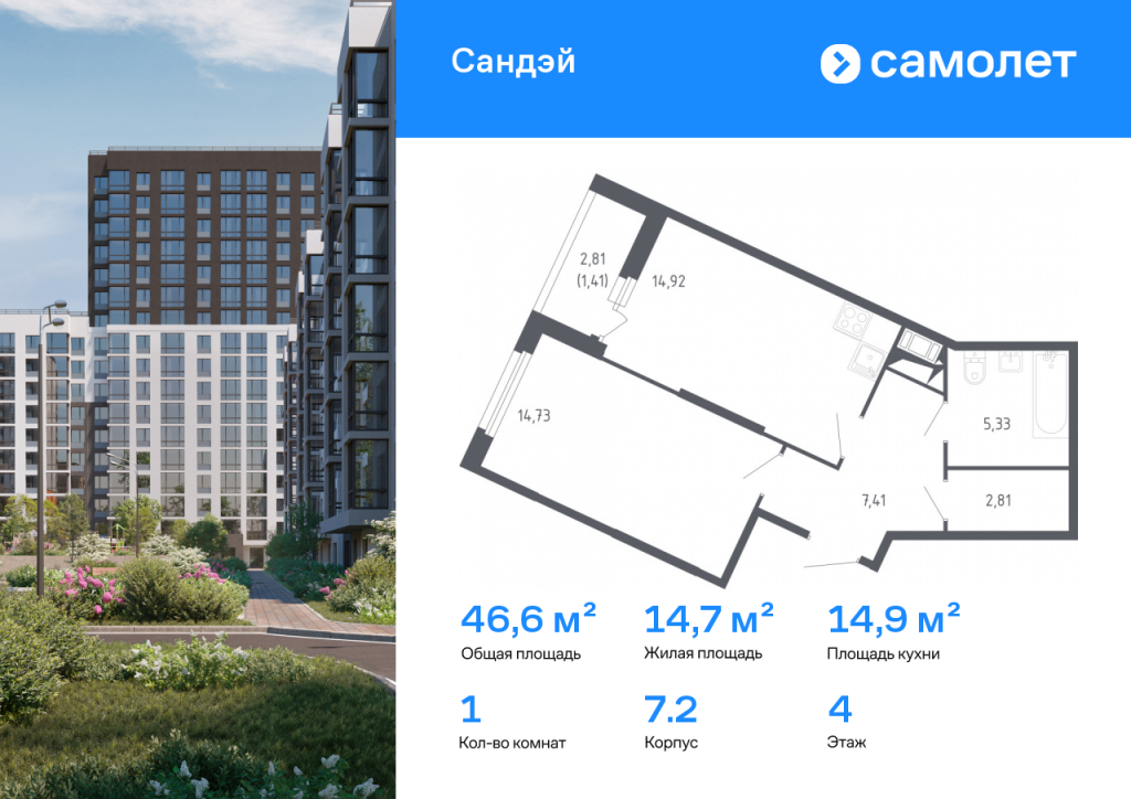 Строим кварталы для жизни с заботой о будущем. Предлагается 1-комнатная квартира комфорт-класса 46,61 кв.м в корпусе 7.2 на 4 этаже, в ЖК «Сандэй» Квартира с чистовой отделкой. Доступность дополнительных опций уточняйте у застройщика. Приобрести квартиру возможно по специальным акциям от застройщика, с текущими условиями акций можно ознакомиться в блоке «Акций». Цена динамическая и может отличаться, уточняйте актуальность у застройщика. Сандэй – современный жилой комплекс на юго-западе Санкт-Петербурга у парка Сосновая поляна. Мы уже построили 7 средне-этажных домов, вся социальная и бытовая инфраструктура уже работает, рядом есть детские сады, школы, поликлиники и магазины – проживание будет очень комфортным. Прямо под окнами большой зеленый парк для прогулок - Сосновая Поляна В 7 минутах пешком расположена железнодорожная станция, от которой можно за 25 минут добраться до центральной части города – Балтийского вокзала. В 15 минутах езды самые известные пригороды Петербурга: Стрельна, Петергоф, а также берег Финского залива.