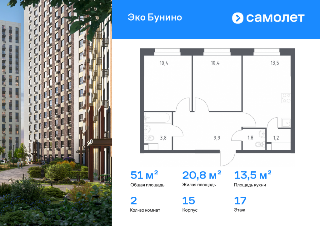 Строим кварталы для жизни с заботой о будущем. Предлагается 2-комнатная квартира комфорт-класса 51 кв.м в корпусе 15 на 17 этаже, в ЖК «Эко Бунино» Квартира с чистовой отделкой. Доступность дополнительных опций уточняйте у застройщика. Приобрести квартиру возможно по специальным акциям от застройщика, с текущими условиями акций можно ознакомиться в блоке «Акций». Цена динамическая и может отличаться, уточняйте актуальность у застройщика. «Эко Бунино» — жилой комплекс в Новой Москве, полностью готовый для жизни. Уже построены школа и детские сады, открыты ледовая арена и магазины. Рядом — 2 станции метро и 3 лесопарка для прогулок. До станции метро «Новомосковская» — 20 минут пешком по экотропе. Во дворах-парках, закрытых от машин, комфортно и безопасно гулять. Здесь высажены уже взрослые деревья, которые создают прохладную тень в жаркий день. Ребенок любого возраста найдет увлекательное занятие в уже готовом плейхабе с большой горкой в виде слона и уникальным игровым оборудованием. Пока дети играют, родители могут прогуляться по бульвару или отдохнуть под навесом из растений. «Эко Бунино» — это 19 монолитных домов переменной этажности. Для облицовки используется навесной вентилируемый фасад и клинкерная плитка, которая имитирует кирпич. Переменная этажность обеспечивает хорошую инсоляцию дворов: в солнечные дни на территории особенно приятно гулять.