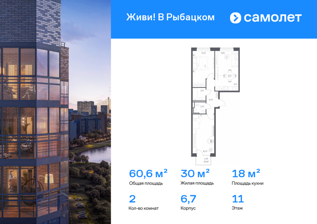 Строим кварталы для жизни с заботой о будущем. Предлагается 2-комнатная квартира комфорт-класса 60,63 кв.м в корпусе 6,7 на 11 этаже, в ЖК «Живи! В Рыбацком» Квартира без отделки. Доступность опции «отделка» и возможность комплектации мебелью и декором уточняйте у застройщика. Приобрести квартиру возможно по специальным акциям от застройщика, с текущими условиями акций можно ознакомиться в блоке «Акций». Цена динамическая и может отличаться, уточняйте актуальность у застройщика. Квартал «Живи! В Рыбацком» в Невском районе Санкт-Петербурга расположен рядом с рекой Славянкой и парком. Всего 20 минут пешей прогулки — и вы у метро «Рыбацкое». Автомобилисты будут добираться до КАДа за десять минут. В квартале работают два детских сада, школа и кабинет врача. На первых этажах зданий открыты магазины, кафе и салоны красоты. Во дворе — зеленые бульвары, воркаут-площадка, спортивный и игровой кластеры. Для машин — подземный паркинг. Кирпично-монолитные дома с каменной облицовкой — воплощение долговечности и тепла. Есть в квартале и камерный 30-й корпус, в нем восемь этажей, 70 квартир и приватный двор-парк. В сквозных парадных — безбарьерная среда, помещения для хранения колясок и велосипедов и система видеонаблюдения.