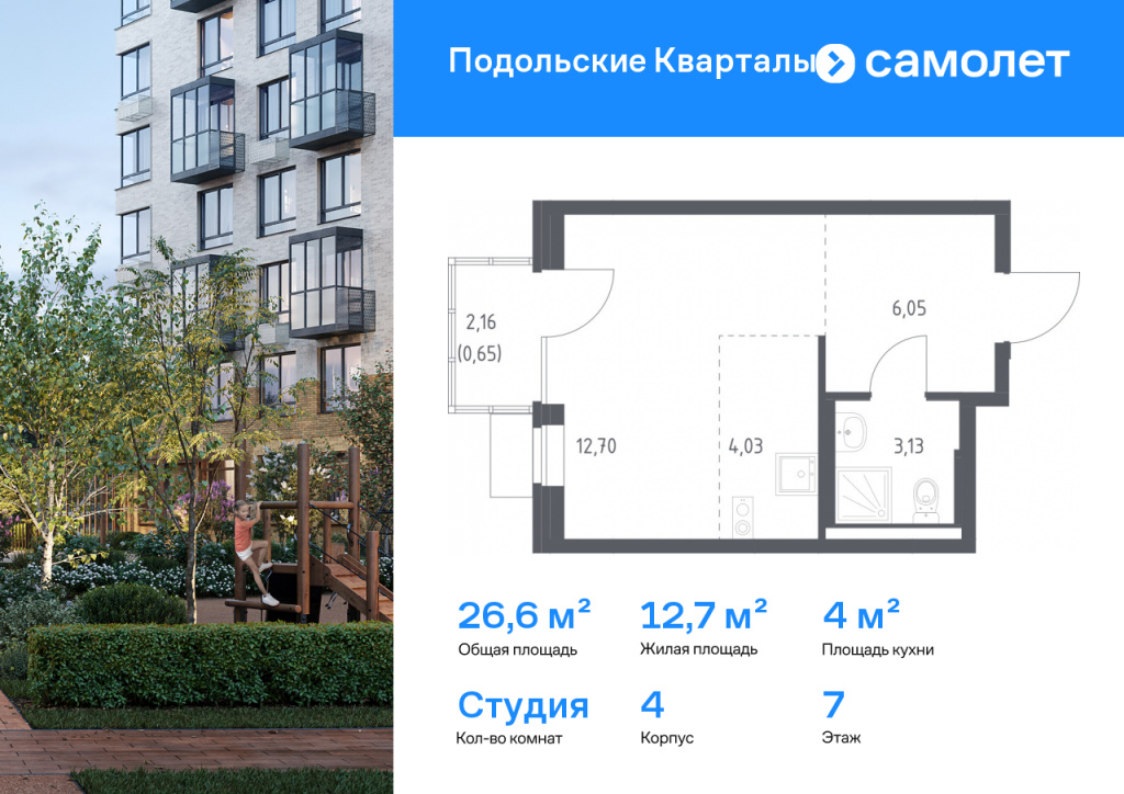 Строим кварталы для жизни с заботой о будущем. Предлагается квартира студия комфорт-класса 26,56 кв.м в корпусе 4 на 7 этаже, в ЖК «Подольские Кварталы» Квартира без отделки. Доступность опции «отделка» и возможность комплектации мебелью и декором уточняйте у застройщика. Приобрести квартиру возможно по специальным акциям от застройщика, с текущими условиями акций можно ознакомиться в блоке «Акций». Цена динамическая и может отличаться, уточняйте актуальность у застройщика. «Подольские кварталы» — жилой комплекс в Новой Москве, рядом с Дубровицким лесом и рекой Десной. До станции МЦД-2 "Остафьево" - 5 минут на общественном транспорте, до станции МЦД-2 «Силикатная» — 8 минут на машине. Рядом — музей-заповедник «Остафьево», усадьбы Плещеево и Дубровицы. В квартале будут детский сад на 200 мест и учебно-воспитательный комплекс на 1 500 мест, в который войдут школа и детский сад. Первые этажи жилых корпусов займут квартиры, кафе, магазины и салоны красоты. Дворы-парки будут радовать жителей цветением и зеленью: здесь высадят липы, сосны, ели, клены и сирень. Плэйхаб станет местом встреч всех любителей активного отдыха: застройщик оборудует зоны тренажеров и воркаута, площадки для игр в настольный теннис, мяч, шахматы. Также появятся современные игровые площадки для детей. Для автовладельцев предусмотрен многоуровневый паркинг. В проекте — монолитные дома высотой от 9 до 12 этажей. Теплые оттенки фасадов соответствуют дизайн-коду «Янтарный берег». Фасады облицованы ложковой кирпичной кладкой.