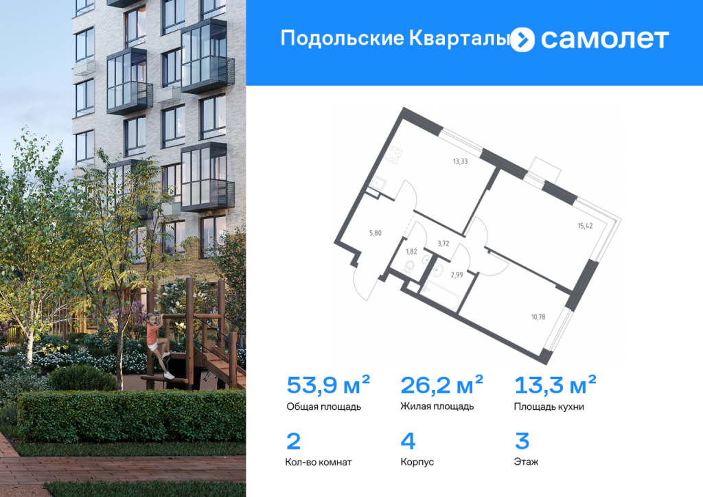 Строим кварталы для жизни с заботой о будущем. Предлагается 2-комнатная квартира комфорт-класса 53,86 кв.м в корпусе 4 на 3 этаже, в ЖК «Подольские Кварталы» Квартира с чистовой отделкой. Доступность дополнительных опций уточняйте у застройщика. Приобрести квартиру возможно по специальным акциям от застройщика, с текущими условиями акций можно ознакомиться в блоке «Акций». Цена динамическая и может отличаться, уточняйте актуальность у застройщика. «Подольские кварталы» — жилой комплекс в Новой Москве, рядом с Дубровицким лесом и рекой Десной. До станции МЦД-2 "Остафьево" - 5 минут на общественном транспорте, до станции МЦД-2 «Силикатная» — 8 минут на машине. Рядом — музей-заповедник «Остафьево», усадьбы Плещеево и Дубровицы. В квартале будут детский сад на 200 мест и учебно-воспитательный комплекс на 1 500 мест, в который войдут школа и детский сад. Первые этажи жилых корпусов займут квартиры, кафе, магазины и салоны красоты. Дворы-парки будут радовать жителей цветением и зеленью: здесь высадят липы, сосны, ели, клены и сирень. Плэйхаб станет местом встреч всех любителей активного отдыха: застройщик оборудует зоны тренажеров и воркаута, площадки для игр в настольный теннис, мяч, шахматы. Также появятся современные игровые площадки для детей. Для автовладельцев предусмотрен многоуровневый паркинг. В проекте — монолитные дома высотой от 9 до 12 этажей. Теплые оттенки фасадов соответствуют дизайн-коду «Янтарный берег». Фасады облицованы ложковой кирпичной кладкой.