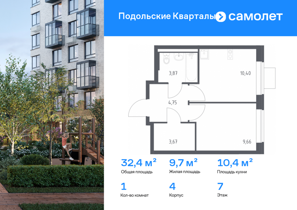 Строим кварталы для жизни с заботой о будущем. Предлагается 1-комнатная квартира комфорт-класса 32,35 кв.м в корпусе 4 на 7 этаже, в ЖК «Подольские Кварталы» Квартира с чистовой отделкой. Доступность дополнительных опций уточняйте у застройщика. Приобрести квартиру возможно по специальным акциям от застройщика, с текущими условиями акций можно ознакомиться в блоке «Акций». Цена динамическая и может отличаться, уточняйте актуальность у застройщика. «Подольские кварталы» — жилой комплекс в Новой Москве, рядом с Дубровицким лесом и рекой Десной. До станции МЦД-2 "Остафьево" - 5 минут на общественном транспорте, до станции МЦД-2 «Силикатная» — 8 минут на машине. Рядом — музей-заповедник «Остафьево», усадьбы Плещеево и Дубровицы. В квартале будут детский сад на 200 мест и учебно-воспитательный комплекс на 1 500 мест, в который войдут школа и детский сад. Первые этажи жилых корпусов займут квартиры, кафе, магазины и салоны красоты. Дворы-парки будут радовать жителей цветением и зеленью: здесь высадят липы, сосны, ели, клены и сирень. Плэйхаб станет местом встреч всех любителей активного отдыха: застройщик оборудует зоны тренажеров и воркаута, площадки для игр в настольный теннис, мяч, шахматы. Также появятся современные игровые площадки для детей. Для автовладельцев предусмотрен многоуровневый паркинг. В проекте — монолитные дома высотой от 9 до 12 этажей. Теплые оттенки фасадов соответствуют дизайн-коду «Янтарный берег». Фасады облицованы ложковой кирпичной кладкой.