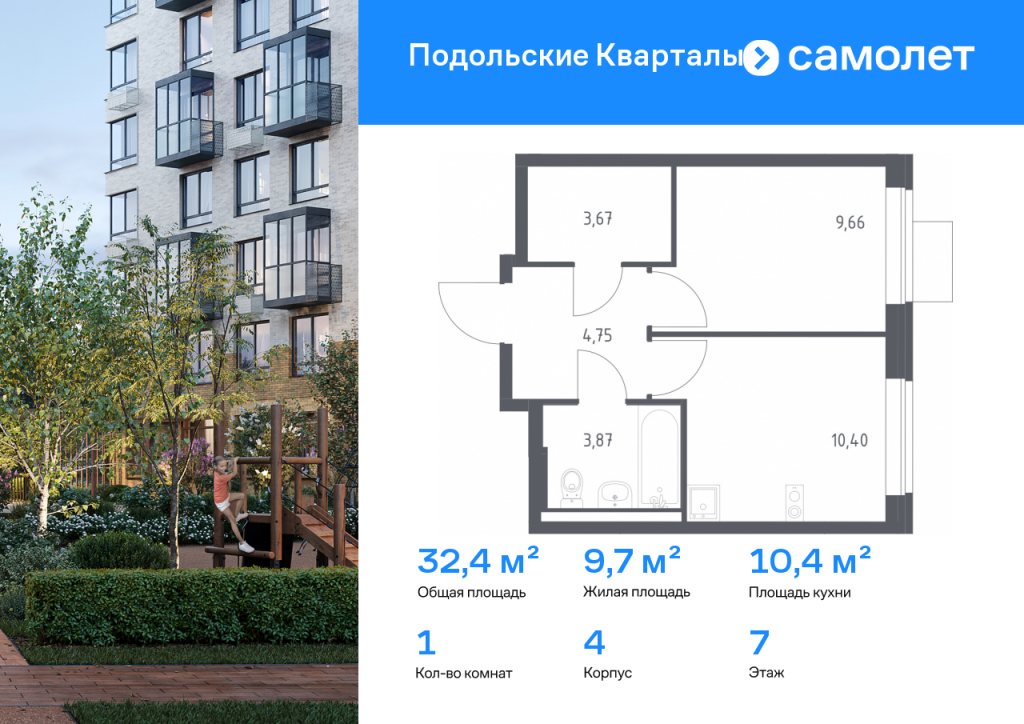 Строим кварталы для жизни с заботой о будущем. Предлагается 1-комнатная квартира комфорт-класса 32,35 кв.м в корпусе 4 на 7 этаже, в ЖК «Подольские Кварталы» Квартира с чистовой отделкой. Доступность дополнительных опций уточняйте у застройщика. Приобрести квартиру возможно по специальным акциям от застройщика, с текущими условиями акций можно ознакомиться в блоке «Акций». Цена динамическая и может отличаться, уточняйте актуальность у застройщика. «Подольские кварталы» — жилой комплекс в Новой Москве, рядом с Дубровицким лесом и рекой Десной. До станции МЦД-2 "Остафьево" - 5 минут на общественном транспорте, до станции МЦД-2 «Силикатная» — 8 минут на машине. Рядом — музей-заповедник «Остафьево», усадьбы Плещеево и Дубровицы. В квартале будут детский сад на 200 мест и учебно-воспитательный комплекс на 1 500 мест, в который войдут школа и детский сад. Первые этажи жилых корпусов займут квартиры, кафе, магазины и салоны красоты. Дворы-парки будут радовать жителей цветением и зеленью: здесь высадят липы, сосны, ели, клены и сирень. Плэйхаб станет местом встреч всех любителей активного отдыха: застройщик оборудует зоны тренажеров и воркаута, площадки для игр в настольный теннис, мяч, шахматы. Также появятся современные игровые площадки для детей. Для автовладельцев предусмотрен многоуровневый паркинг. В проекте — монолитные дома высотой от 9 до 12 этажей. Теплые оттенки фасадов соответствуют дизайн-коду «Янтарный берег». Фасады облицованы ложковой кирпичной кладкой.