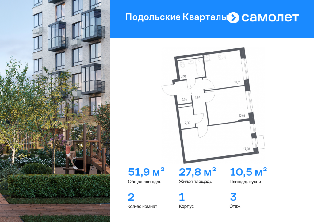 Строим кварталы для жизни с заботой о будущем. Предлагается 2-комнатная квартира комфорт-класса 51,91 кв.м в корпусе 1 на 3 этаже, в ЖК «Подольские Кварталы» Квартира без отделки. Доступность опции «отделка» и возможность комплектации мебелью и декором уточняйте у застройщика. Приобрести квартиру возможно по специальным акциям от застройщика, с текущими условиями акций можно ознакомиться в блоке «Акций». Цена динамическая и может отличаться, уточняйте актуальность у застройщика. «Подольские кварталы» — жилой комплекс в Новой Москве, рядом с Дубровицким лесом и рекой Десной. До станции МЦД-2 "Остафьево" - 5 минут на общественном транспорте, до станции МЦД-2 «Силикатная» — 8 минут на машине. Рядом — музей-заповедник «Остафьево», усадьбы Плещеево и Дубровицы. В квартале будут детский сад на 200 мест и учебно-воспитательный комплекс на 1 500 мест, в который войдут школа и детский сад. Первые этажи жилых корпусов займут квартиры, кафе, магазины и салоны красоты. Дворы-парки будут радовать жителей цветением и зеленью: здесь высадят липы, сосны, ели, клены и сирень. Плэйхаб станет местом встреч всех любителей активного отдыха: застройщик оборудует зоны тренажеров и воркаута, площадки для игр в настольный теннис, мяч, шахматы. Также появятся современные игровые площадки для детей. Для автовладельцев предусмотрен многоуровневый паркинг. В проекте — монолитные дома высотой от 9 до 12 этажей. Теплые оттенки фасадов соответствуют дизайн-коду «Янтарный берег». Фасады облицованы ложковой кирпичной кладкой.