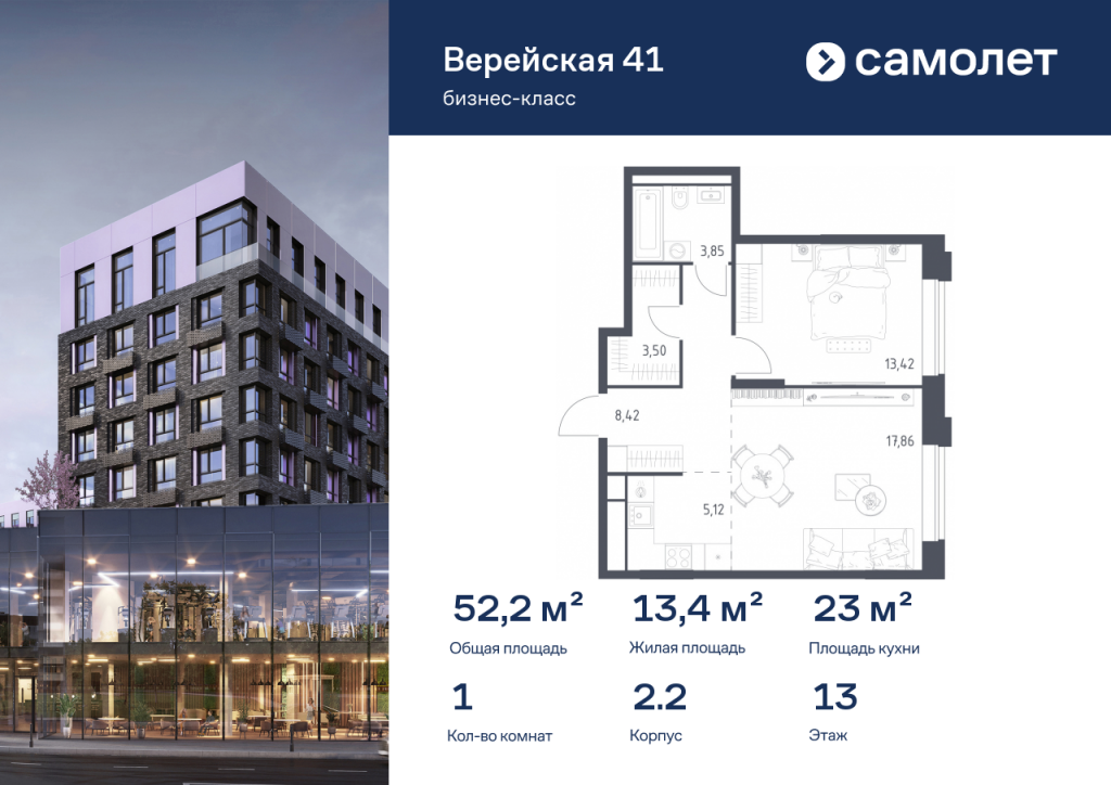 Строим кварталы для жизни с заботой о будущем. Предлагается 1-комнатная квартира бизнес-класса 52,17 кв.м в корпусе 2.2 на 13 этаже, в «Верейская 41» Квартира без отделки. Доступность опции «отделка» и возможность комплектации мебелью и декором уточняйте у застройщика. Приобрести квартиру возможно по специальным акциям от застройщика, с текущими условиями акций можно ознакомиться в блоке «Акций». Цена динамическая и может отличаться, уточняйте актуальность у застройщика. «Верейская 41» — проект бизнес-класса рядом с «Долиной реки Сетунь» и Кутузовским проспектом. Из панорамных окон открываются виды на природный заказник. Комплекс включает 4 урбан-блока высотой до 14 этажей, зеленые террасы, сад с навесами из растений, спортивные и игровые площадки, плоскостной и 2 подземных паркинга. Планировки сдаются с дизайнерской отделкой в природных тонах.