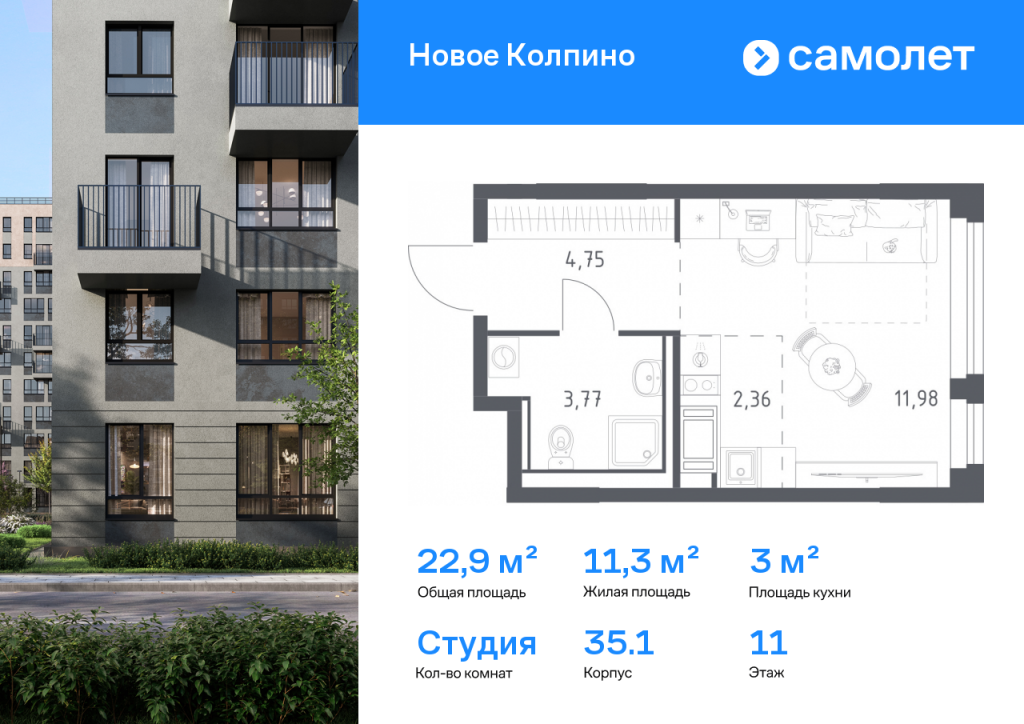 Строим кварталы для жизни с заботой о будущем. Предлагается квартира студия комфорт-класса 22,86 кв.м в корпусе 35.1 на 11 этаже, в ЖК «Новое Колпино» Квартира с чистовой отделкой. Доступность дополнительных опций уточняйте у застройщика. Приобрести квартиру возможно по специальным акциям от застройщика, с текущими условиями акций можно ознакомиться в блоке «Акций». Цена динамическая и может отличаться, уточняйте актуальность у застройщика. Квартал «Новое Колпино» — современный квартал в тихом и зеленом районе Санкт-Петербурга. Здесь можно подолгу любоваться пышными кронами деревьев, подставляя лицо теплым лучам солнца. А еще в любой момент можно сесть в машину и уже через час оказаться в сердце Северной столицы. Будет легко планировать поездки: до центра Петербурга, или площади Восстания, — 25 минут на поезде. С территории квартала удобно выезжать на крупные магистрали: путь до Южного шоссе займет 15 минут на авто, а до Петрозаводского шоссе — всего 6 минут. В 20 минутах на авто находится метро «Рыбацкое», а в 7 минутах — ж/д станция Колпино. Проводите выходные на природе в Колпинском парке, который находится недалеко от квартала, на берегу реки Ижоры. Летом здесь можно вместе с детьми веселиться на аттракционах, кататься на лодке, играть в бадминтон или волейбол. А еще можно захватить орехов и покормить белок. Всего 7 минут на авто или автобусе — и вы в центре города Колпино. Взрослых впечатлит русская архитектура старинных церквей, а детям понравится забавный памятник героям мультфильма «Трое из Простоквашино». В «Новом Колпино» будут работать 4 детских сада, 3 из них уже готовы встречать малышей. Ребята постарше могут ходить на занятия в школу с собственным бассейном, в проекте уже работает новая современная школа с бассейном Корпуса высотой 11 этажей с французскими и панорамными балконами отделаны штукатуркой и облицовочным кирпичом. Вдохновение для палитры нам подарили оттенки рассветного неба: терракотовый, персиковый, песочный. Во дворе найдется интересное занятие для всех жителей квартала. Взрослые смогут устраивать тренировки на свежем воздухе в спортивных зонах, дети будут целый день веселиться на игровых площадках. А еще мы позаботились о вашей безопасности и закрыли дворы от машин. Возвращайтесь домой с чемоданом из путешествия или коляской из парка. На пути в подъезд вы не встретите ступенек. Оставить транспорт можно будет в специальном помещении на первом этаже. По желанию вы сможете получить ключи от квартиры с готовой отделкой. Мы положим ламинат, поклеим обои, установим мебель и сантехнику. Доступен вариант с готовой кухней — бежевые тона отделки станут фоном для интерьера мечты. Чтобы сразу отпраздновать новоселье, закажите у нас декор и мебельные сеты. А если хочется воплотить собственные идеи в интерьере, присмотритесь к опции — без отделки.