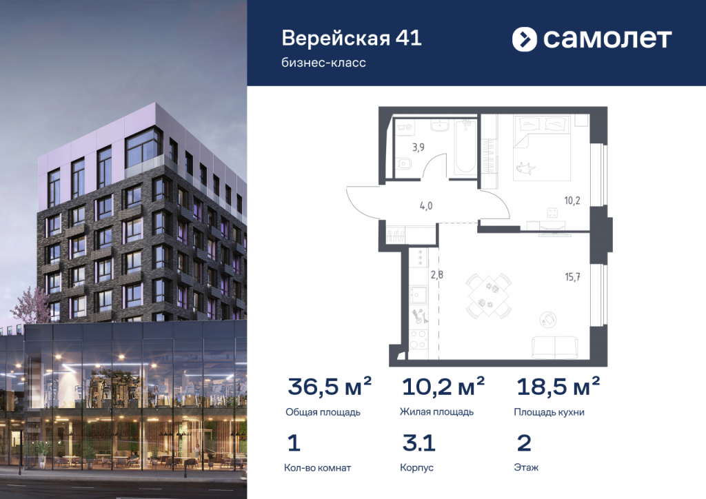Строим кварталы для жизни с заботой о будущем. Предлагается 1-комнатная квартира бизнес-класса 36,52 кв.м в корпусе 3.1 на 2 этаже, в «Верейская 41» Квартира с предчистовой отделкой. Доступность дополнительных опций уточняйте у застройщика. Приобрести квартиру возможно по специальным акциям от застройщика, с текущими условиями акций можно ознакомиться в блоке «Акций». Цена динамическая и может отличаться, уточняйте актуальность у застройщика. «Верейская 41» — проект бизнес-класса рядом с «Долиной реки Сетунь» и Кутузовским проспектом. Из панорамных окон открываются виды на природный заказник. Комплекс включает 4 урбан-блока высотой до 14 этажей, зеленые террасы, сад с навесами из растений, спортивные и игровые площадки, плоскостной и 2 подземных паркинга. Планировки сдаются с дизайнерской отделкой в природных тонах.