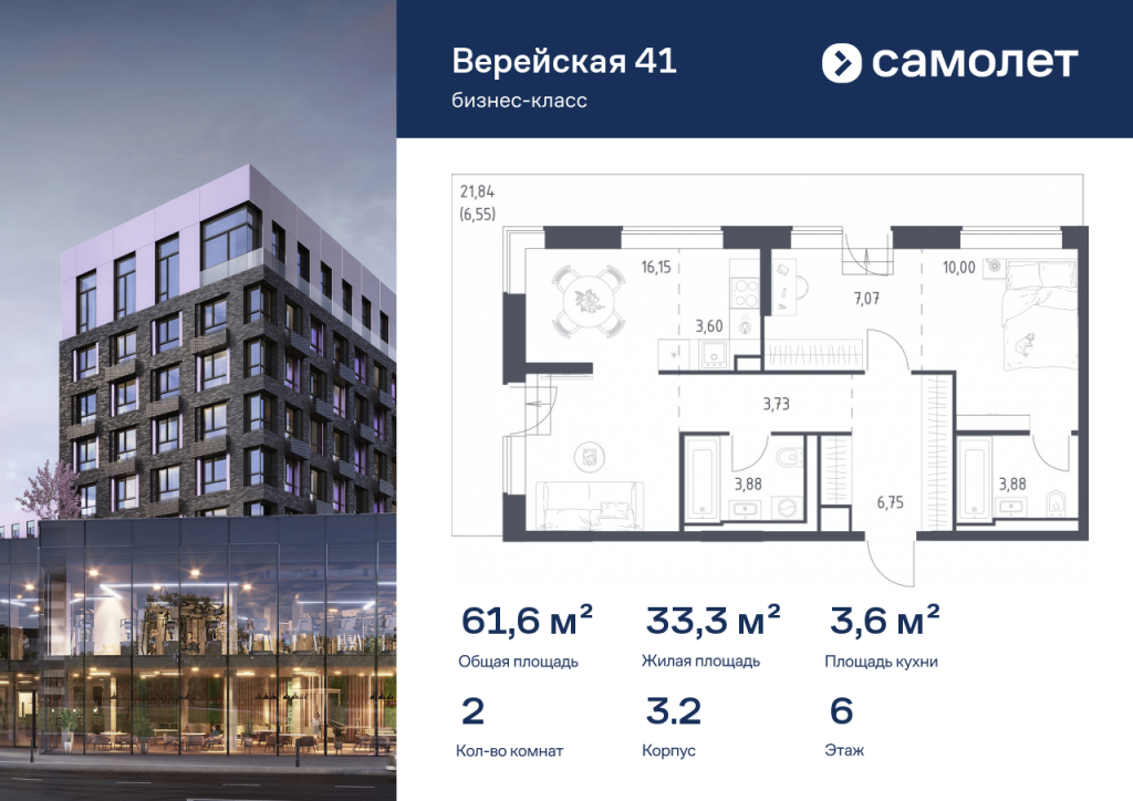 Строим кварталы для жизни с заботой о будущем. Предлагается 2-комнатная квартира бизнес-класса 61,61 кв.м в корпусе 3.2 на 6 этаже, в «Верейская 41» Квартира без отделки. Доступность опции «отделка» и возможность комплектации мебелью и декором уточняйте у застройщика. Приобрести квартиру возможно по специальным акциям от застройщика, с текущими условиями акций можно ознакомиться в блоке «Акций». Цена динамическая и может отличаться, уточняйте актуальность у застройщика. «Верейская 41» — проект бизнес-класса рядом с «Долиной реки Сетунь» и Кутузовским проспектом. Из панорамных окон открываются виды на природный заказник. Комплекс включает 4 урбан-блока высотой до 14 этажей, зеленые террасы, сад с навесами из растений, спортивные и игровые площадки, плоскостной и 2 подземных паркинга. Планировки сдаются с дизайнерской отделкой в природных тонах.