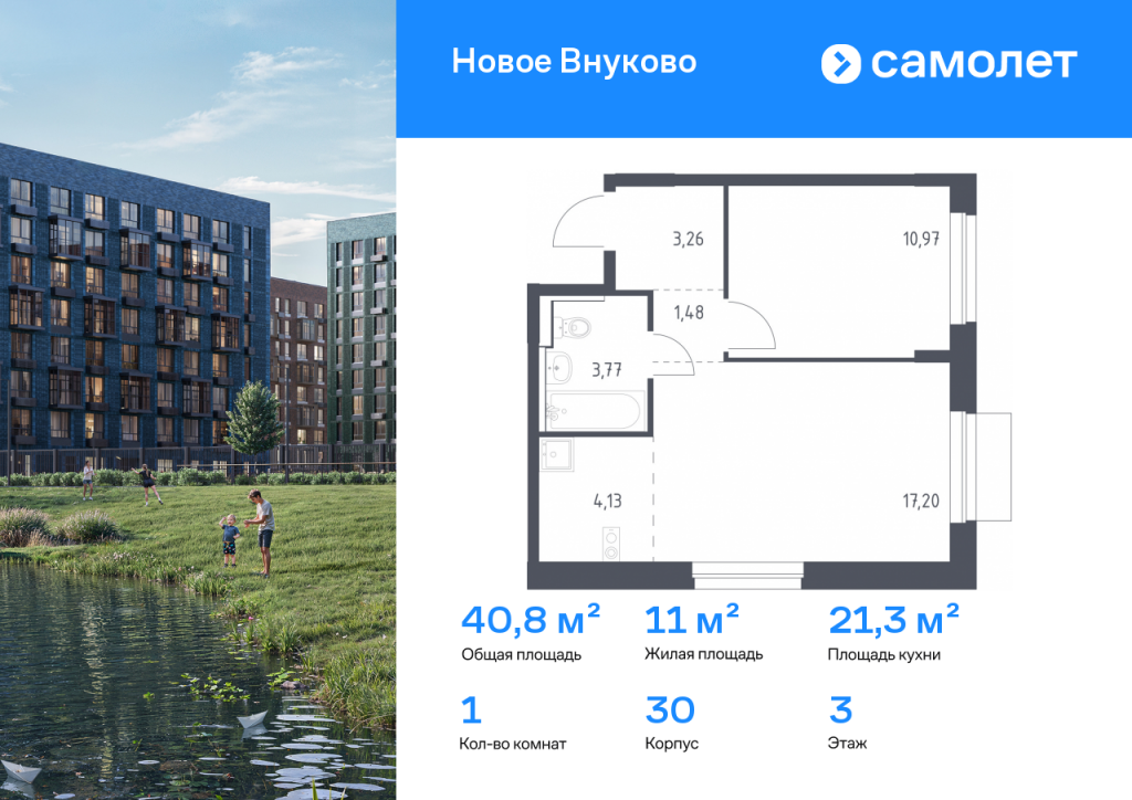Строим кварталы для жизни с заботой о будущем. Предлагается 1-комнатная квартира комфорт-класса 40,81 кв.м в корпусе 30 на 3 этаже, в ЖК «Новое Внуково» Квартира с чистовой отделкой. Доступность дополнительных опций уточняйте у застройщика. Приобрести квартиру возможно по специальным акциям от застройщика, с текущими условиями акций можно ознакомиться в блоке «Акций». Цена динамическая и может отличаться, уточняйте актуальность у застройщика. «Новое Внуково» — это жилой комплекс в Новой Москве, у подножия берега реки Незнайка. Поблизости — живописные места для прогулок: народный парк «Ручеек», усадьба Старо-Никольское, Валуевский и Ульяновский лесопарки. Часть домов сдана и внутри района уже открыт детсад с бассейном, а в ближайшее время откроются еще 3 детсада, 2 школы и поликлиника. На территории проекта будет построен первый в России Центр Российской Федерации Баскетбола, где будут площадки с трибунами, тренажерный зал, кафе и конференц-зал. Дворы-парки закрыты от машин и посторонних. На территории — прогулочный маршрут вдоль реки Незнайка и набережная с шезлонгами и качелями для отдыха. Также здесь появится плейхаб «Незнайка на Луне», площадь для мероприятий с сухим фонтаном, летним кинотеатром и кафе. В жилом комплексе — монолитные дома высотой от 6 до 14 этажей. Фасады облицованы кирпичом природных оттенков.
