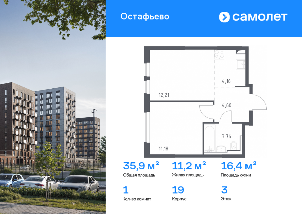 Строим кварталы для жизни с заботой о будущем. Предлагается 1-комнатная квартира комфорт-класса 35,91 кв.м в корпусе 19 на 3 этаже, в ЖК «Остафьево» Квартира без отделки. Доступность опции «отделка» и возможность комплектации мебелью и декором уточняйте у застройщика. Приобрести квартиру возможно по специальным акциям от застройщика, с текущими условиями акций можно ознакомиться в блоке «Акций». Цена динамическая и может отличаться, уточняйте актуальность у застройщика. «Остафьево» — масштабный жилой комплекс в Новой Москве, рядом с одноименным музеем-усадьбой и городским парком «Барыши». До станций МЦД «Щербинка» и «Остафьево» можно добраться на автомобиле за 5–7 минут. Часть домов уже сдана, на территории открыты две школы и три детских сада, а в будущем будет построена поликлиника, ТЦ, еще одна школа и три детских сада. Все необходимое рядом: на первых этажах домов работают магазины, аптеки и кафе. Дворы — приватные мини-парки без машин и посторонних. Кроме игровых площадок, для детей обустроили тематический плейхаб «Маяк». В будущем появятся плейхаб «Алиса в стране чудес», арт-объект «Тропа зеркал», а также большой ландшафтный парк. В квартале — монолитные дома комфортной высоты, от 10 этажей. Светлые фасады украшают кирпичные вставки в теплых природных оттенках.