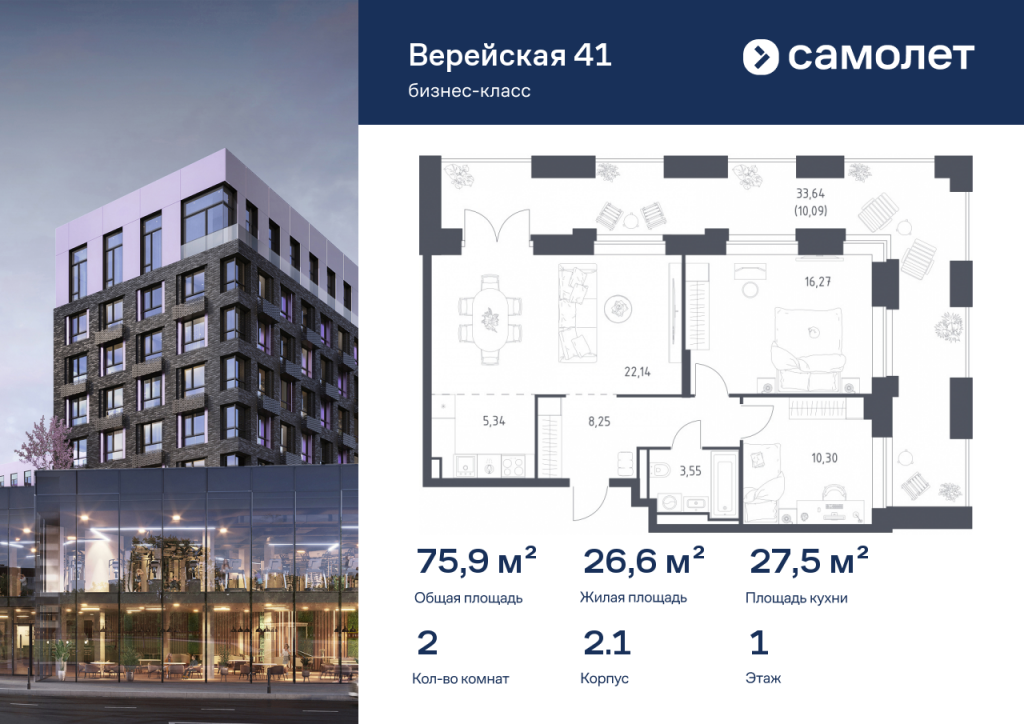 Строим кварталы для жизни с заботой о будущем. Предлагается 2-комнатная квартира бизнес-класса 75,94 кв.м в корпусе 2.1 на 1 этаже, в «Верейская 41» Квартира без отделки. Доступность опции «отделка» и возможность комплектации мебелью и декором уточняйте у застройщика. Приобрести квартиру возможно по специальным акциям от застройщика, с текущими условиями акций можно ознакомиться в блоке «Акций». Цена динамическая и может отличаться, уточняйте актуальность у застройщика. «Верейская 41» — проект бизнес-класса рядом с «Долиной реки Сетунь» и Кутузовским проспектом. Из панорамных окон открываются виды на природный заказник. Комплекс включает 4 урбан-блока высотой до 14 этажей, зеленые террасы, сад с навесами из растений, спортивные и игровые площадки, плоскостной и 2 подземных паркинга. Планировки сдаются с дизайнерской отделкой в природных тонах.