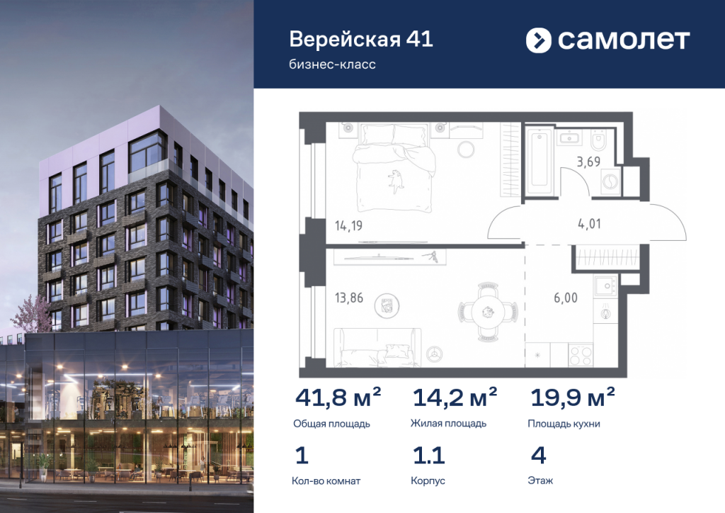 Строим кварталы для жизни с заботой о будущем. Предлагается 1-комнатная квартира бизнес-класса 41,75 кв.м в корпусе 1.1 на 4 этаже, в «Верейская 41» Квартира с предчистовой отделкой. Доступность дополнительных опций уточняйте у застройщика. Приобрести квартиру возможно по специальным акциям от застройщика, с текущими условиями акций можно ознакомиться в блоке «Акций». Цена динамическая и может отличаться, уточняйте актуальность у застройщика. «Верейская 41» — проект бизнес-класса рядом с «Долиной реки Сетунь» и Кутузовским проспектом. Из панорамных окон открываются виды на природный заказник. Комплекс включает 4 урбан-блока высотой до 14 этажей, зеленые террасы, сад с навесами из растений, спортивные и игровые площадки, плоскостной и 2 подземных паркинга. Планировки сдаются с дизайнерской отделкой в природных тонах.
