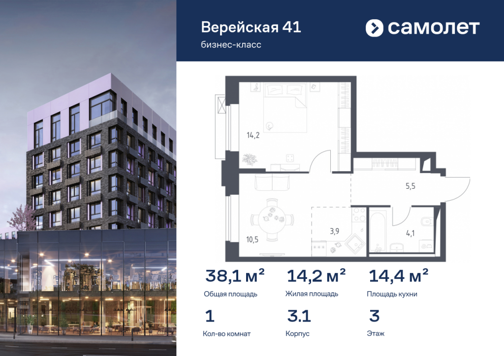 Строим кварталы для жизни с заботой о будущем. Предлагается 1-комнатная квартира бизнес-класса 38,11 кв.м в корпусе 3.1 на 3 этаже, в «Верейская 41» Квартира с предчистовой отделкой. Доступность дополнительных опций уточняйте у застройщика. Приобрести квартиру возможно по специальным акциям от застройщика, с текущими условиями акций можно ознакомиться в блоке «Акций». Цена динамическая и может отличаться, уточняйте актуальность у застройщика. «Верейская 41» — проект бизнес-класса рядом с «Долиной реки Сетунь» и Кутузовским проспектом. Из панорамных окон открываются виды на природный заказник. Комплекс включает 4 урбан-блока высотой до 14 этажей, зеленые террасы, сад с навесами из растений, спортивные и игровые площадки, плоскостной и 2 подземных паркинга. Планировки сдаются с дизайнерской отделкой в природных тонах.