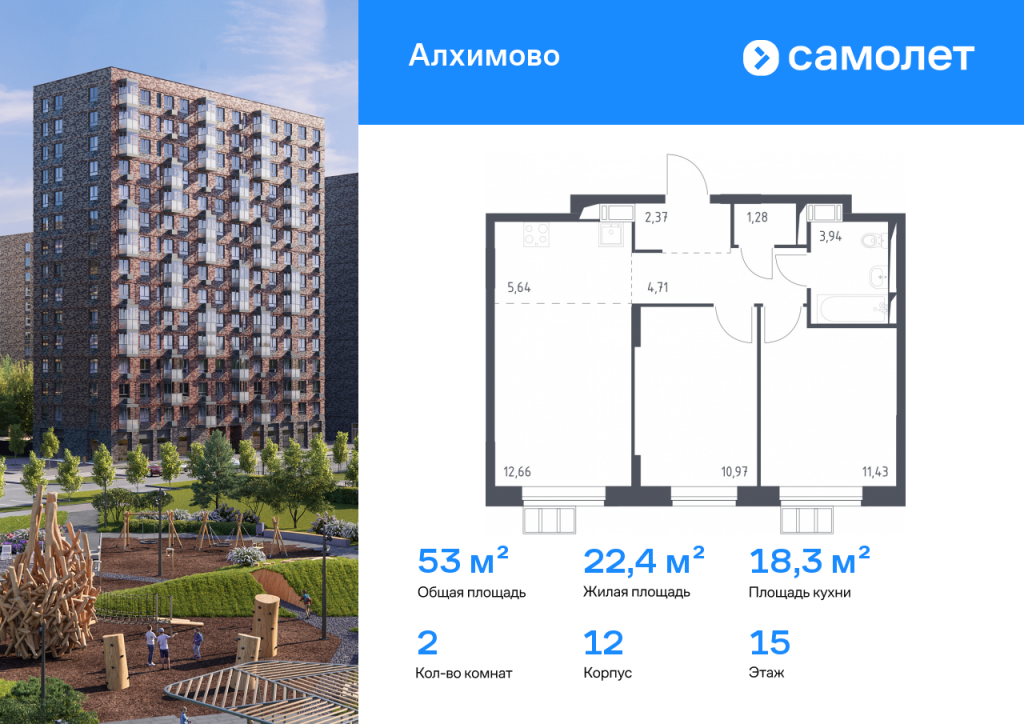 Строим кварталы для жизни с заботой о будущем. Предлагается 2-комнатная квартира комфорт-класса 53 кв.м в корпусе 12 на 15 этаже, в ЖК «Алхимово» Квартира с чистовой отделкой. Доступность дополнительных опций уточняйте у застройщика. Приобрести квартиру возможно по специальным акциям от застройщика, с текущими условиями акций можно ознакомиться в блоке «Акций». Цена динамическая и может отличаться, уточняйте актуальность у застройщика. «Алхимово» — жилой комплекс в Новой Москве, в 16 км от МКАД. Рядом — живописный Дубровицкий лесопарк и река Десна. На территории уже есть свои школа и детский сад, ведется строительство еще одного детского сада. Супермаркеты, аптеки и кафе — в паре шагов от дома. В будущем появится свой торговый центр. В квартале есть воркаут-зона, игровые площадки, отдельная площадка для выгула собак. Дворы закрыты от машин, для автомобилистов предусмотрен многоуровневый паркинг. В проекте — монолитные дома высотой от 8 до 16 этажей. Фасады облицованы декоративным кирпичом естественных оттенков.