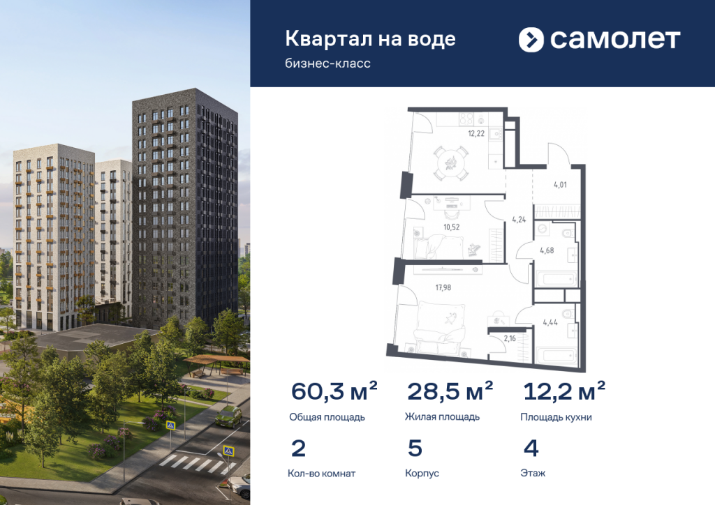 Строим кварталы для жизни с заботой о будущем. Предлагается 2-комнатная квартира бизнес-класса 60,25 кв.м в корпусе 5 на 4 этаже, в ЖК «Квартал на воде» Квартира без отделки. Доступность опции «отделка» и возможность комплектации мебелью и декором уточняйте у застройщика. Приобрести квартиру возможно по специальным акциям от застройщика, с текущими условиями акций можно ознакомиться в блоке «Акций». Цена динамическая и может отличаться, уточняйте актуальность у застройщика. «Квартал на воде» — жилой комплекс бизнес-класса на берегу Москвы-реки, в районе Печатники. Включает дома переменной этажности, собственную благоустроенную набережную и приватные дворы-парки. Проект — пример минималистичной архитектуры от бюро Kleinewelt Architekten. До МЦД-2 «Перерва» — 5 минут пешком. В конце 2027 года рядом откроется станция метро «Курьяново».