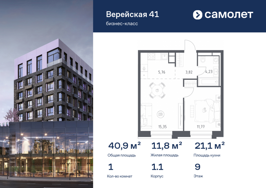 Строим кварталы для жизни с заботой о будущем. Предлагается 1-комнатная квартира бизнес-класса 40,93 кв.м в корпусе 1.1 на 9 этаже, в «Верейская 41» Квартира с предчистовой отделкой. Доступность дополнительных опций уточняйте у застройщика. Приобрести квартиру возможно по специальным акциям от застройщика, с текущими условиями акций можно ознакомиться в блоке «Акций». Цена динамическая и может отличаться, уточняйте актуальность у застройщика. «Верейская 41» — проект бизнес-класса рядом с «Долиной реки Сетунь» и Кутузовским проспектом. Из панорамных окон открываются виды на природный заказник. Комплекс включает 4 урбан-блока высотой до 14 этажей, зеленые террасы, сад с навесами из растений, спортивные и игровые площадки, плоскостной и 2 подземных паркинга. Планировки сдаются с дизайнерской отделкой в природных тонах.