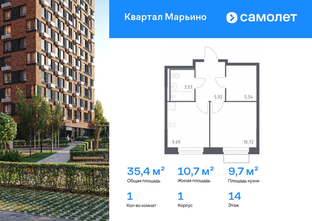Строим кварталы для жизни с заботой о будущем. Предлагается 1-комнатная квартира комфорт-класса 35,4 кв.м в корпусе 1 на 14 этаже, в ЖК «Квартал Марьино» Квартира без отделки. Доступность опции «отделка» и возможность комплектации мебелью и декором уточняйте у застройщика. Приобрести квартиру возможно по специальным акциям от застройщика, с текущими условиями акций можно ознакомиться в блоке «Акций». Цена динамическая и может отличаться, уточняйте актуальность у застройщика. «Квартал Марьино» — проект в Новой Москве, в 18 км от МКАД, вблизи Валуевского лесопарка. Здесь будет все, чтобы получать удовольствие от жизни: приватные дворы-парки без машин, инфраструктура в шаговой доступности и общественные пространства для разнообразных занятий на свежем воздухе. До станции метро «Филатов луг» — 15 минут на машине по Филимонковскому шоссе. Живописные места для отдыха на природе — на расстоянии 2-5 км от дома. На территории будут построены 6 детских садов, 4 школы, поликлиника и спортивный комплекс, а также кафе, магазины и салоны красоты на первых этажах жилых домов. В закрытых дворах-парках предусмотрены игровые площадки, лужайки для пикников и йоги. Пространства для спокойного отдыха будут огорожены живыми изгородями. Дизайн-код проекта — «Полевые цветы». Он прослеживается в каждой детали — от натуральных оттенков фасадов до элементов благоустройства в эко-стиле.