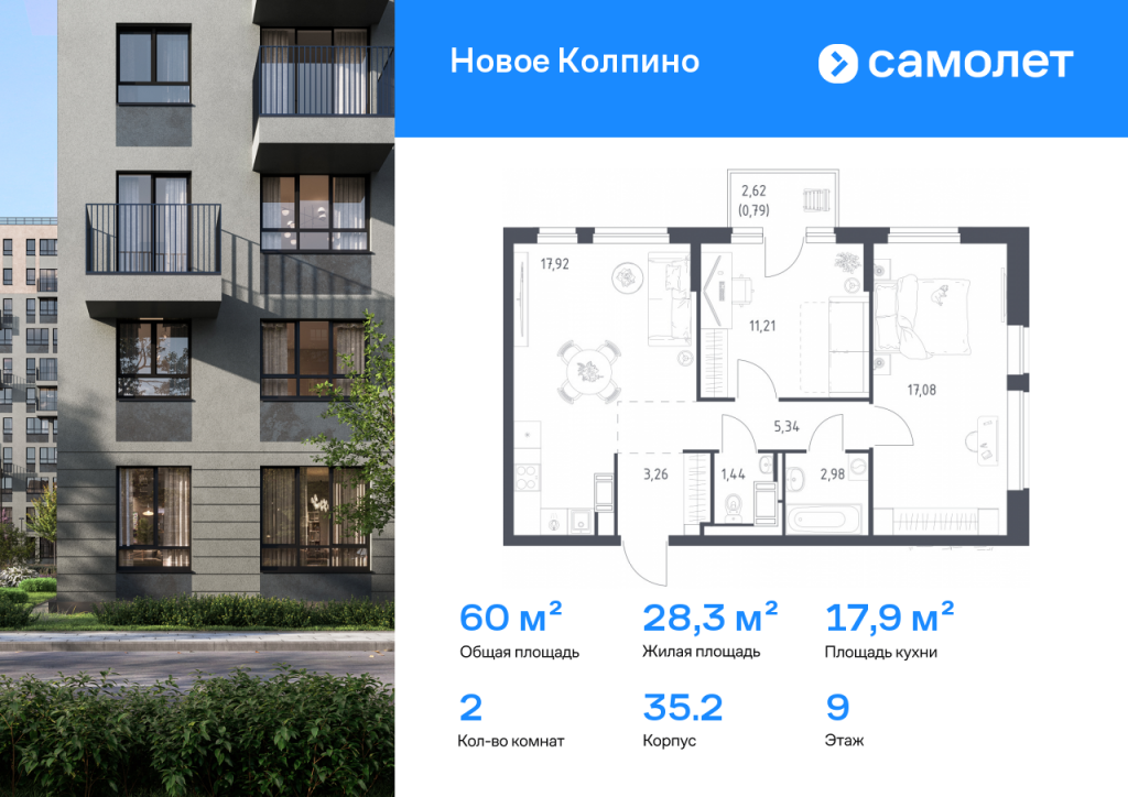 Строим кварталы для жизни с заботой о будущем. Предлагается 2-комнатная квартира комфорт-класса 60,02 кв.м в корпусе 35.2 на 9 этаже, в ЖК «Новое Колпино» Квартира без отделки. Доступность опции «отделка» и возможность комплектации мебелью и декором уточняйте у застройщика. Приобрести квартиру возможно по специальным акциям от застройщика, с текущими условиями акций можно ознакомиться в блоке «Акций». Цена динамическая и может отличаться, уточняйте актуальность у застройщика. Квартал «Новое Колпино» — современный квартал в тихом и зеленом районе Санкт-Петербурга. Здесь можно подолгу любоваться пышными кронами деревьев, подставляя лицо теплым лучам солнца. А еще в любой момент можно сесть в машину и уже через час оказаться в сердце Северной столицы. Будет легко планировать поездки: до центра Петербурга, или площади Восстания, — 25 минут на поезде. С территории квартала удобно выезжать на крупные магистрали: путь до Южного шоссе займет 15 минут на авто, а до Петрозаводского шоссе — всего 6 минут. В 20 минутах на авто находится метро «Рыбацкое», а в 7 минутах — ж/д станция Колпино. Проводите выходные на природе в Колпинском парке, который находится недалеко от квартала, на берегу реки Ижоры. Летом здесь можно вместе с детьми веселиться на аттракционах, кататься на лодке, играть в бадминтон или волейбол. А еще можно захватить орехов и покормить белок. Всего 7 минут на авто или автобусе — и вы в центре города Колпино. Взрослых впечатлит русская архитектура старинных церквей, а детям понравится забавный памятник героям мультфильма «Трое из Простоквашино». В «Новом Колпино» будут работать 4 детских сада, 3 из них уже готовы встречать малышей. Ребята постарше могут ходить на занятия в школу с собственным бассейном, в проекте уже работает новая современная школа с бассейном Корпуса высотой 11 этажей с французскими и панорамными балконами отделаны штукатуркой и облицовочным кирпичом. Вдохновение для палитры нам подарили оттенки рассветного неба: терракотовый, персиковый, песочный. Во дворе найдется интересное занятие для всех жителей квартала. Взрослые смогут устраивать тренировки на свежем воздухе в спортивных зонах, дети будут целый день веселиться на игровых площадках. А еще мы позаботились о вашей безопасности и закрыли дворы от машин. Возвращайтесь домой с чемоданом из путешествия или коляской из парка. На пути в подъезд вы не встретите ступенек. Оставить транспорт можно будет в специальном помещении на первом этаже. По желанию вы сможете получить ключи от квартиры с готовой отделкой. Мы положим ламинат, поклеим обои, установим мебель и сантехнику. Доступен вариант с готовой кухней — бежевые тона отделки станут фоном для интерьера мечты. Чтобы сразу отпраздновать новоселье, закажите у нас декор и мебельные сеты. А если хочется воплотить собственные идеи в интерьере, присмотритесь к опции — без отделки.