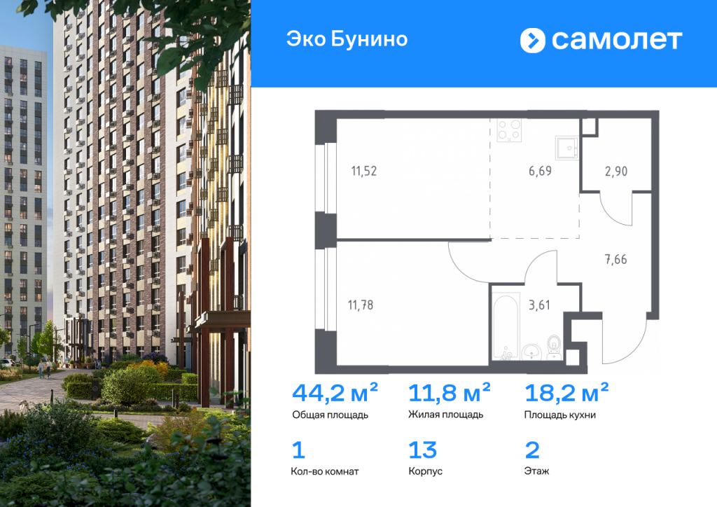 Строим кварталы для жизни с заботой о будущем. Предлагается 1-комнатная квартира комфорт-класса 44,16 кв.м в корпусе 13 на 2 этаже, в ЖК «Эко Бунино» Квартира без отделки. Доступность опции «отделка» и возможность комплектации мебелью и декором уточняйте у застройщика. Приобрести квартиру возможно по специальным акциям от застройщика, с текущими условиями акций можно ознакомиться в блоке «Акций». Цена динамическая и может отличаться, уточняйте актуальность у застройщика. «Эко Бунино» — жилой комплекс в Новой Москве, полностью готовый для жизни. Уже построены школа и детские сады, открыты ледовая арена и магазины. Рядом — 2 станции метро и 3 лесопарка для прогулок. До станции метро «Новомосковская» — 20 минут пешком по экотропе. Во дворах-парках, закрытых от машин, комфортно и безопасно гулять. Здесь высажены уже взрослые деревья, которые создают прохладную тень в жаркий день. Ребенок любого возраста найдет увлекательное занятие в уже готовом плейхабе с большой горкой в виде слона и уникальным игровым оборудованием. Пока дети играют, родители могут прогуляться по бульвару или отдохнуть под навесом из растений. «Эко Бунино» — это 19 монолитных домов переменной этажности. Для облицовки используется навесной вентилируемый фасад и клинкерная плитка, которая имитирует кирпич. Переменная этажность обеспечивает хорошую инсоляцию дворов: в солнечные дни на территории особенно приятно гулять.