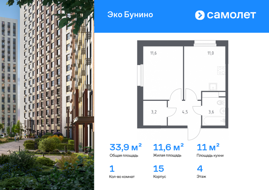 Строим кварталы для жизни с заботой о будущем. Предлагается 1-комнатная квартира комфорт-класса 33,9 кв.м в корпусе 15 на 4 этаже, в ЖК «Эко Бунино» Квартира с чистовой отделкой. Доступность дополнительных опций уточняйте у застройщика. Приобрести квартиру возможно по специальным акциям от застройщика, с текущими условиями акций можно ознакомиться в блоке «Акций». Цена динамическая и может отличаться, уточняйте актуальность у застройщика. «Эко Бунино» — жилой комплекс в Новой Москве, полностью готовый для жизни. Уже построены школа и детские сады, открыты ледовая арена и магазины. Рядом — 2 станции метро и 3 лесопарка для прогулок. До станции метро «Новомосковская» — 20 минут пешком по экотропе. Во дворах-парках, закрытых от машин, комфортно и безопасно гулять. Здесь высажены уже взрослые деревья, которые создают прохладную тень в жаркий день. Ребенок любого возраста найдет увлекательное занятие в уже готовом плейхабе с большой горкой в виде слона и уникальным игровым оборудованием. Пока дети играют, родители могут прогуляться по бульвару или отдохнуть под навесом из растений. «Эко Бунино» — это 19 монолитных домов переменной этажности. Для облицовки используется навесной вентилируемый фасад и клинкерная плитка, которая имитирует кирпич. Переменная этажность обеспечивает хорошую инсоляцию дворов: в солнечные дни на территории особенно приятно гулять.