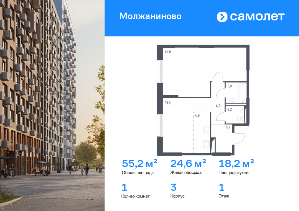 Строим кварталы для жизни с заботой о будущем. Предлагается 1-комнатная квартира комфорт-класса 55,2 кв.м в корпусе 3 на 1 этаже, в ЖК «Молжаниново» Квартира с чистовой отделкой. Доступность дополнительных опций уточняйте у застройщика. Приобрести квартиру возможно по специальным акциям от застройщика, с текущими условиями акций можно ознакомиться в блоке «Акций». Цена динамическая и может отличаться, уточняйте актуальность у застройщика. Жилой комплекс «Молжаниново» — это место, где каждый маршрут продуман так, чтобы вы проводили больше времени с близкими, а не в дороге. Ставьте паруса в канале имени Москвы, устраивайте пикники в Химкинском лесу или ищите редких птиц в Захарьинской пойме. Жилой комплекс сочетает в себе комфорт городской жизни с преимуществами природы. С одной стороны — московская регистрация, собственная инфраструктура, благоустроенные дворы с детскими площадками и зонами отдыха. С другой — ручей и пруд прямо на территории, а также много леса вокруг.