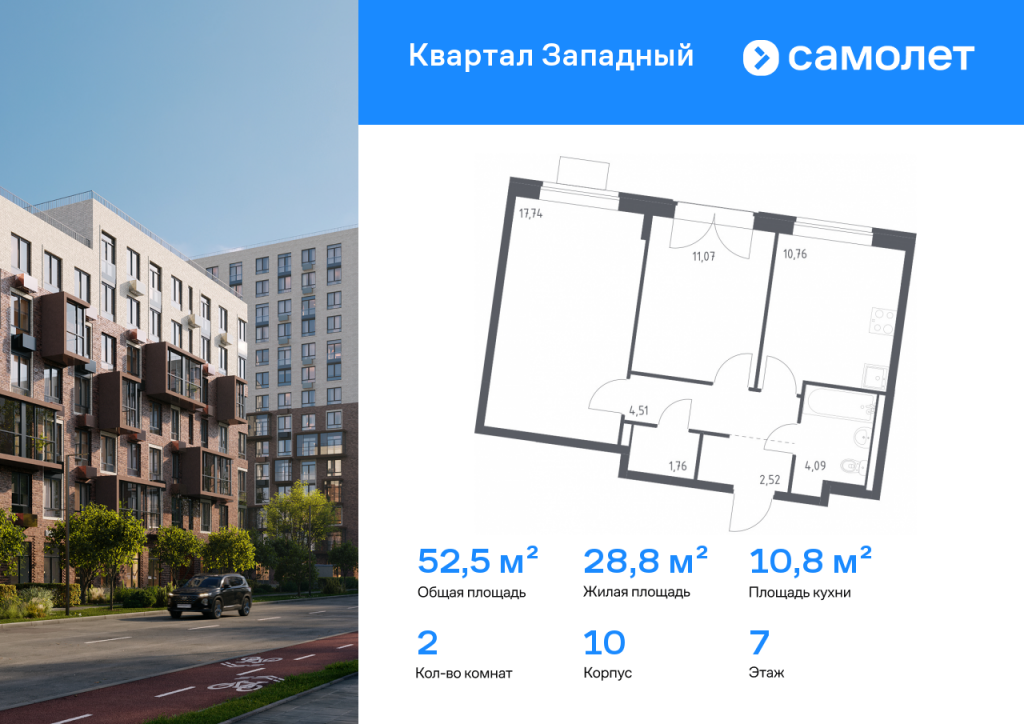 Строим кварталы для жизни с заботой о будущем. Предлагается 2-комнатная квартира комфорт-класса 52,45 кв.м в корпусе 10 на 7 этаже, в ЖК «Квартал Западный» Квартира с чистовой отделкой. Доступность дополнительных опций уточняйте у застройщика. Приобрести квартиру возможно по специальным акциям от застройщика, с текущими условиями акций можно ознакомиться в блоке «Акций». Цена динамическая и может отличаться, уточняйте актуальность у застройщика. Жилой комплекс в окружении лесопарков и рядом с рекой. До станции МЦД-4 «Санино» можно дойти пешком за 7 минут, а на территории проекта появится транспортно-пересадочный узел с торговым центром. Для жителей построят школу, 2 детсада, в одном из которых будут развивающие кабинеты-трансформеры. Дворы — тихое зеленое пространство без машин. В проекте появится собственный ландшафтный парк с благоустроенной набережной и центральная площадь, на которой будут проводиться различные мероприятия. Высота домов — от 5 до 15 этажей. Фасады выполняют в естественных оттенках, в соответствии с дизайн-кодом «Полевой луг». У каждой секции — свое цветовое решение. Белый цвет верхних этажей добавляет застройке легкости. Фасады облицованы клинкерным глазурованным кирпичом, который используют в проектах бизнес-класса.