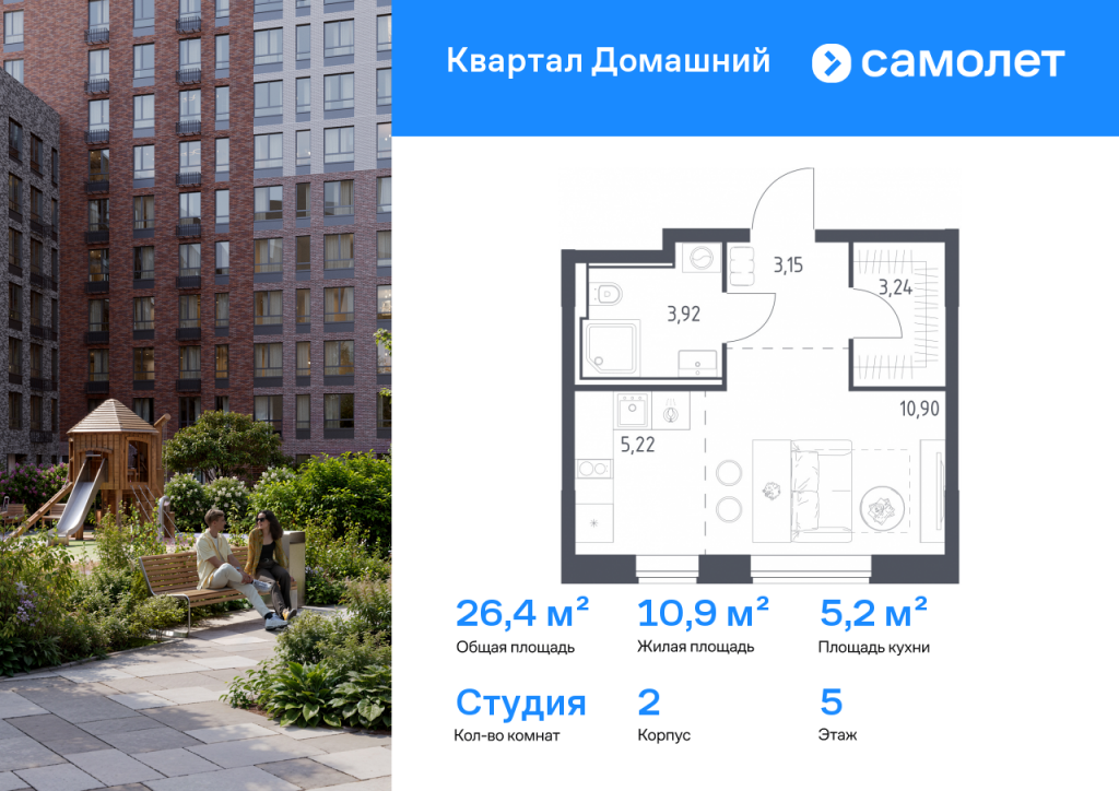 Строим кварталы для жизни с заботой о будущем. Предлагается квартира студия комфорт-класса 26,43 кв.м в корпусе 2 на 5 этаже, в ЖК «Квартал Домашний» Квартира с чистовой отделкой. Доступность дополнительных опций уточняйте у застройщика. Приобрести квартиру возможно по специальным акциям от застройщика, с текущими условиями акций можно ознакомиться в блоке «Акций». Цена динамическая и может отличаться, уточняйте актуальность у застройщика. «Квартал Домашний» находится в Марьино — всего 7 минут пешком до МЦД-2 «Курьяново». Рядом с домом — набережная Москвы-реки. Внутренняя инфраструктура проекта продумана до мелочей: от супермаркетов до кафе и салонов красоты. В «Квартале Домашнем» можно выбирать свою высоту — в комплексе есть корпуса от 7 до 19 этажей. Среди планировочных решений — просторные кухни-гостиные, гардеробные, постирочные, лоджии и угловые окна. «Квартал Домашний» — это: 1. До станции МЦД-2 «Курьяново» — 7 минут пешком 2. До парка 850-летия Москвы — 5 минут пешком 3. До парка «Борисовские пруды» — 15 минут на машине 4. До музея-заповедника «Царицыно» — 20 минут на авто 5. Музей-заповедник «Коломенское» — для фотосессий и прогулок 6. Европейская архитектура с фасадами природных оттенков: песочного, серого, зеленого, терракотового 7. Школа со стадионом, 2 детских сада — на территории квартала 8. Магазины, кафе и салоны красоты на первых этажах домов 9. Приватные дворы без машин 10. Подземный паркинг с местами для электрокаров и индивидуальные кладовые 11. Спортивные и игровые площадки