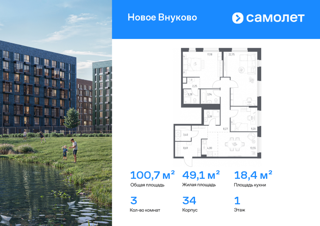 Строим кварталы для жизни с заботой о будущем. Предлагается 3-комнатная квартира комфорт-класса 100,7 кв.м в корпусе 34 на 1 этаже, в ЖК «Новое Внуково» Квартира с чистовой отделкой. Доступность дополнительных опций уточняйте у застройщика. Приобрести квартиру возможно по специальным акциям от застройщика, с текущими условиями акций можно ознакомиться в блоке «Акций». Цена динамическая и может отличаться, уточняйте актуальность у застройщика. «Новое Внуково» — это жилой комплекс в Новой Москве, у подножия берега реки Незнайка. Поблизости — живописные места для прогулок: народный парк «Ручеек», усадьба Старо-Никольское, Валуевский и Ульяновский лесопарки. Часть домов сдана и внутри района уже открыт детсад с бассейном, а в ближайшее время откроются еще 3 детсада, 2 школы и поликлиника. На территории проекта будет построен первый в России Центр Российской Федерации Баскетбола, где будут площадки с трибунами, тренажерный зал, кафе и конференц-зал. Дворы-парки закрыты от машин и посторонних. На территории — прогулочный маршрут вдоль реки Незнайка и набережная с шезлонгами и качелями для отдыха. Также здесь появится плейхаб «Незнайка на Луне», площадь для мероприятий с сухим фонтаном, летним кинотеатром и кафе. В жилом комплексе — монолитные дома высотой от 6 до 14 этажей. Фасады облицованы кирпичом природных оттенков.