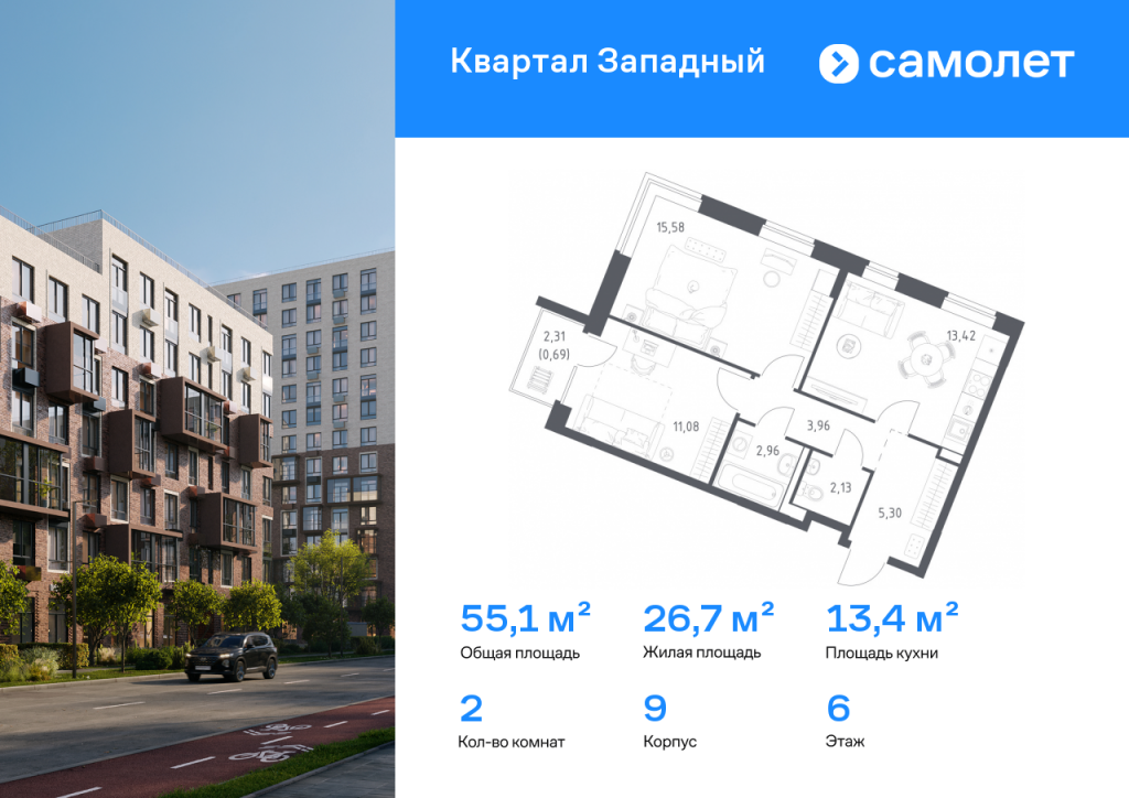 Строим кварталы для жизни с заботой о будущем. Предлагается 2-комнатная квартира комфорт-класса 55,12 кв.м в корпусе 9 на 6 этаже, в ЖК «Квартал Западный» Квартира с чистовой отделкой. Доступность дополнительных опций уточняйте у застройщика. Приобрести квартиру возможно по специальным акциям от застройщика, с текущими условиями акций можно ознакомиться в блоке «Акций». Цена динамическая и может отличаться, уточняйте актуальность у застройщика. Жилой комплекс в окружении лесопарков и рядом с рекой. До станции МЦД-4 «Санино» можно дойти пешком за 7 минут, а на территории проекта появится транспортно-пересадочный узел с торговым центром. Для жителей построят школу, 2 детсада, в одном из которых будут развивающие кабинеты-трансформеры. Дворы — тихое зеленое пространство без машин. В проекте появится собственный ландшафтный парк с благоустроенной набережной и центральная площадь, на которой будут проводиться различные мероприятия. Высота домов — от 5 до 15 этажей. Фасады выполняют в естественных оттенках, в соответствии с дизайн-кодом «Полевой луг». У каждой секции — свое цветовое решение. Белый цвет верхних этажей добавляет застройке легкости. Фасады облицованы клинкерным глазурованным кирпичом, который используют в проектах бизнес-класса.