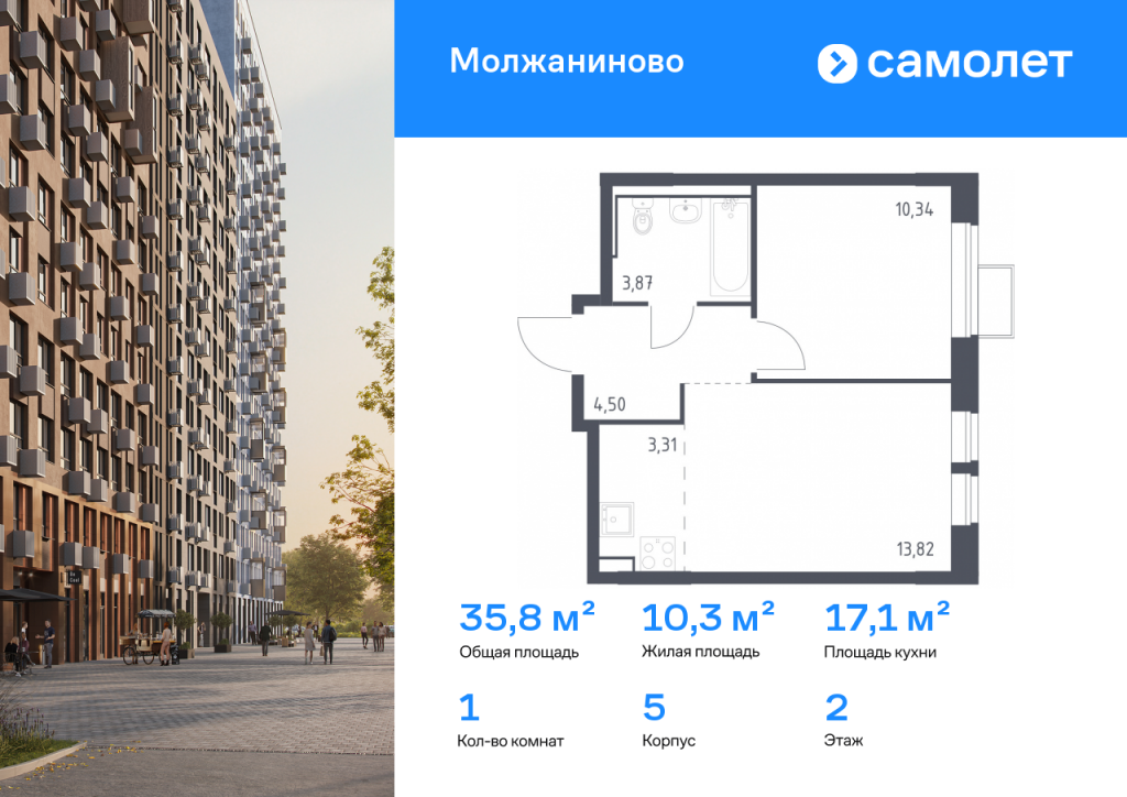 Строим кварталы для жизни с заботой о будущем. Предлагается 1-комнатная квартира комфорт-класса 35,84 кв.м в корпусе 5 на 2 этаже, в ЖК «Молжаниново» Квартира с чистовой отделкой. Доступность дополнительных опций уточняйте у застройщика. Приобрести квартиру возможно по специальным акциям от застройщика, с текущими условиями акций можно ознакомиться в блоке «Акций». Цена динамическая и может отличаться, уточняйте актуальность у застройщика. Жилой комплекс «Молжаниново» — это место, где каждый маршрут продуман так, чтобы вы проводили больше времени с близкими, а не в дороге. Ставьте паруса в канале имени Москвы, устраивайте пикники в Химкинском лесу или ищите редких птиц в Захарьинской пойме. Жилой комплекс сочетает в себе комфорт городской жизни с преимуществами природы. С одной стороны — московская регистрация, собственная инфраструктура, благоустроенные дворы с детскими площадками и зонами отдыха. С другой — ручей и пруд прямо на территории, а также много леса вокруг.