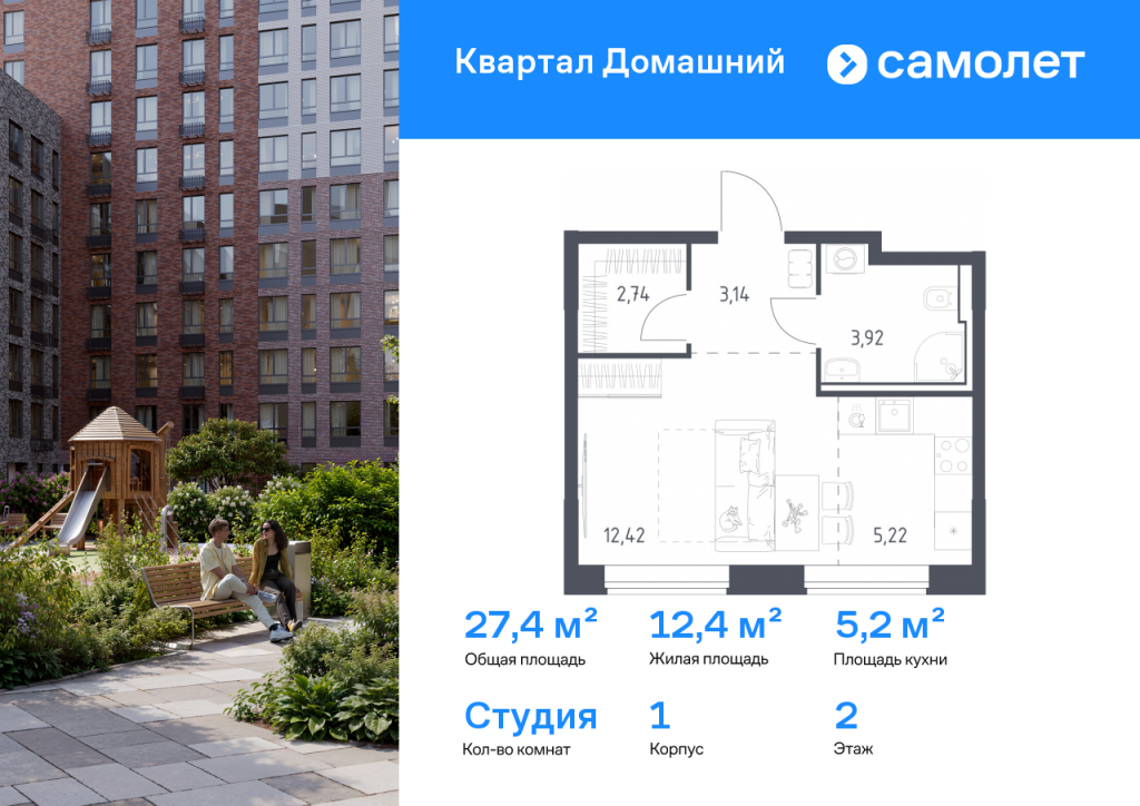 Строим кварталы для жизни с заботой о будущем. Предлагается квартира студия комфорт-класса 27,44 кв.м в корпусе 1 на 2 этаже, в ЖК «Квартал Домашний» Квартира без отделки. Доступность опции «отделка» и возможность комплектации мебелью и декором уточняйте у застройщика. Приобрести квартиру возможно по специальным акциям от застройщика, с текущими условиями акций можно ознакомиться в блоке «Акций». Цена динамическая и может отличаться, уточняйте актуальность у застройщика. «Квартал Домашний» находится в Марьино — всего 7 минут пешком до МЦД-2 «Курьяново». Рядом с домом — набережная Москвы-реки. Внутренняя инфраструктура проекта продумана до мелочей: от супермаркетов до кафе и салонов красоты. В «Квартале Домашнем» можно выбирать свою высоту — в комплексе есть корпуса от 7 до 19 этажей. Среди планировочных решений — просторные кухни-гостиные, гардеробные, постирочные, лоджии и угловые окна. «Квартал Домашний» — это: 1. До станции МЦД-2 «Курьяново» — 7 минут пешком 2. До парка 850-летия Москвы — 5 минут пешком 3. До парка «Борисовские пруды» — 15 минут на машине 4. До музея-заповедника «Царицыно» — 20 минут на авто 5. Музей-заповедник «Коломенское» — для фотосессий и прогулок 6. Европейская архитектура с фасадами природных оттенков: песочного, серого, зеленого, терракотового 7. Школа со стадионом, 2 детских сада — на территории квартала 8. Магазины, кафе и салоны красоты на первых этажах домов 9. Приватные дворы без машин 10. Подземный паркинг с местами для электрокаров и индивидуальные кладовые 11. Спортивные и игровые площадки