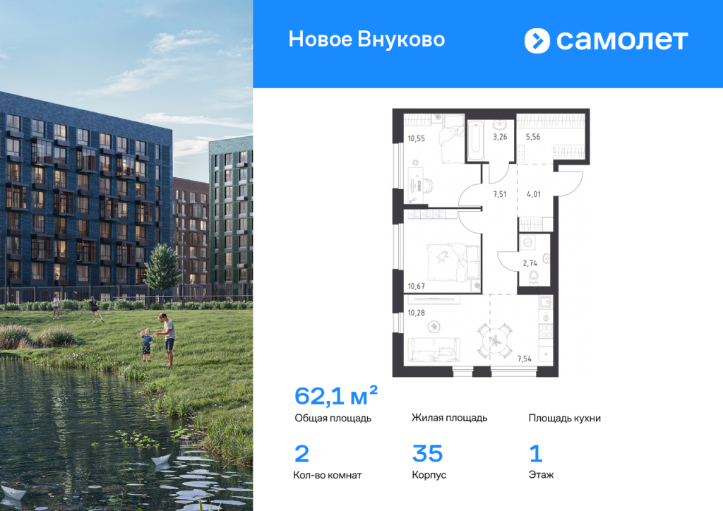 Строим кварталы для жизни с заботой о будущем. Предлагается 2-комнатная квартира комфорт-класса 62,12 кв.м в корпусе 35 на 1 этаже, в ЖК «Новое Внуково» Квартира без отделки. Доступность опции «отделка» и возможность комплектации мебелью и декором уточняйте у застройщика. Приобрести квартиру возможно по специальным акциям от застройщика, с текущими условиями акций можно ознакомиться в блоке «Акций». Цена динамическая и может отличаться, уточняйте актуальность у застройщика. «Новое Внуково» — это жилой комплекс в Новой Москве, у подножия берега реки Незнайка. Поблизости — живописные места для прогулок: народный парк «Ручеек», усадьба Старо-Никольское, Валуевский и Ульяновский лесопарки. Часть домов сдана и внутри района уже открыт детсад с бассейном, а в ближайшее время откроются еще 3 детсада, 2 школы и поликлиника. На территории проекта будет построен первый в России Центр Российской Федерации Баскетбола, где будут площадки с трибунами, тренажерный зал, кафе и конференц-зал. Дворы-парки закрыты от машин и посторонних. На территории — прогулочный маршрут вдоль реки Незнайка и набережная с шезлонгами и качелями для отдыха. Также здесь появится плейхаб «Незнайка на Луне», площадь для мероприятий с сухим фонтаном, летним кинотеатром и кафе. В жилом комплексе — монолитные дома высотой от 6 до 14 этажей. Фасады облицованы кирпичом природных оттенков.