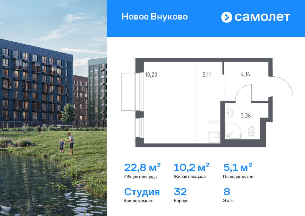 Строим кварталы для жизни с заботой о будущем. Предлагается квартира студия комфорт-класса 22,83 кв.м в корпусе 32 на 8 этаже, в ЖК «Новое Внуково» Квартира без отделки. Доступность опции «отделка» и возможность комплектации мебелью и декором уточняйте у застройщика. Приобрести квартиру возможно по специальным акциям от застройщика, с текущими условиями акций можно ознакомиться в блоке «Акций». Цена динамическая и может отличаться, уточняйте актуальность у застройщика. «Новое Внуково» — это жилой комплекс в Новой Москве, у подножия берега реки Незнайка. Поблизости — живописные места для прогулок: народный парк «Ручеек», усадьба Старо-Никольское, Валуевский и Ульяновский лесопарки. Часть домов сдана и внутри района уже открыт детсад с бассейном, а в ближайшее время откроются еще 3 детсада, 2 школы и поликлиника. На территории проекта будет построен первый в России Центр Российской Федерации Баскетбола, где будут площадки с трибунами, тренажерный зал, кафе и конференц-зал. Дворы-парки закрыты от машин и посторонних. На территории — прогулочный маршрут вдоль реки Незнайка и набережная с шезлонгами и качелями для отдыха. Также здесь появится плейхаб «Незнайка на Луне», площадь для мероприятий с сухим фонтаном, летним кинотеатром и кафе. В жилом комплексе — монолитные дома высотой от 6 до 14 этажей. Фасады облицованы кирпичом природных оттенков.