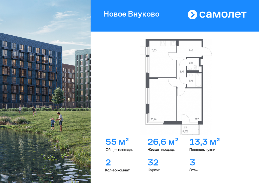 Строим кварталы для жизни с заботой о будущем. Предлагается 2-комнатная квартира комфорт-класса 55,03 кв.м в корпусе 32 на 3 этаже, в ЖК «Новое Внуково» Квартира с чистовой отделкой. Доступность дополнительных опций уточняйте у застройщика. Приобрести квартиру возможно по специальным акциям от застройщика, с текущими условиями акций можно ознакомиться в блоке «Акций». Цена динамическая и может отличаться, уточняйте актуальность у застройщика. «Новое Внуково» — это жилой комплекс в Новой Москве, у подножия берега реки Незнайка. Поблизости — живописные места для прогулок: народный парк «Ручеек», усадьба Старо-Никольское, Валуевский и Ульяновский лесопарки. Часть домов сдана и внутри района уже открыт детсад с бассейном, а в ближайшее время откроются еще 3 детсада, 2 школы и поликлиника. На территории проекта будет построен первый в России Центр Российской Федерации Баскетбола, где будут площадки с трибунами, тренажерный зал, кафе и конференц-зал. Дворы-парки закрыты от машин и посторонних. На территории — прогулочный маршрут вдоль реки Незнайка и набережная с шезлонгами и качелями для отдыха. Также здесь появится плейхаб «Незнайка на Луне», площадь для мероприятий с сухим фонтаном, летним кинотеатром и кафе. В жилом комплексе — монолитные дома высотой от 6 до 14 этажей. Фасады облицованы кирпичом природных оттенков.