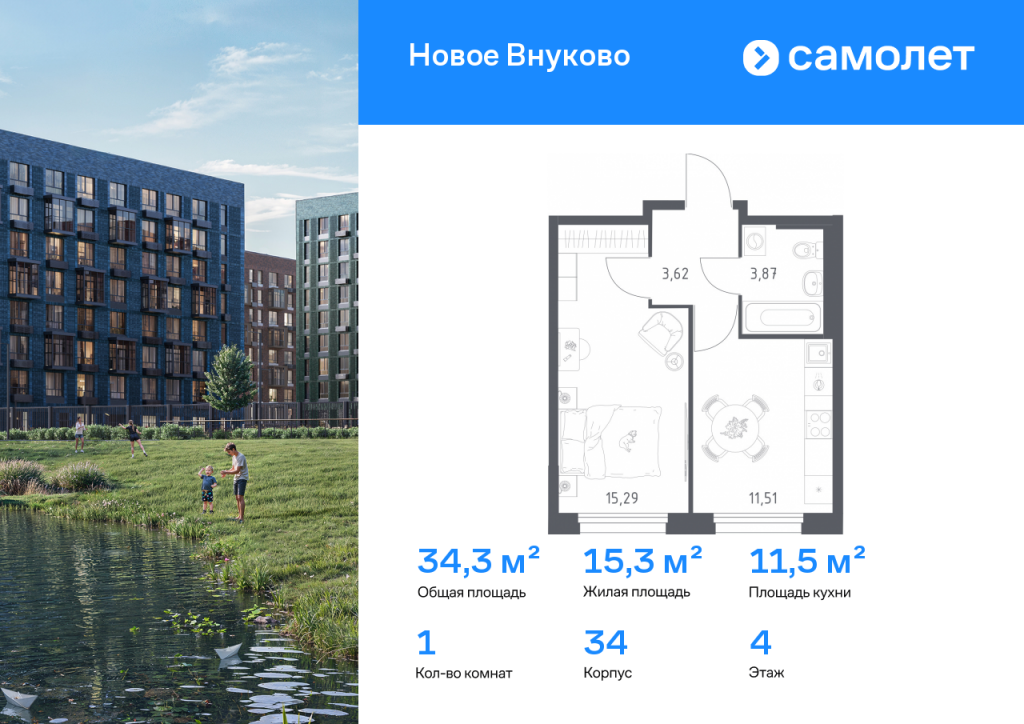 Строим кварталы для жизни с заботой о будущем. Предлагается 1-комнатная квартира комфорт-класса 34,29 кв.м в корпусе 34 на 4 этаже, в ЖК «Новое Внуково» Квартира с чистовой отделкой. Доступность дополнительных опций уточняйте у застройщика. Приобрести квартиру возможно по специальным акциям от застройщика, с текущими условиями акций можно ознакомиться в блоке «Акций». Цена динамическая и может отличаться, уточняйте актуальность у застройщика. «Новое Внуково» — это жилой комплекс в Новой Москве, у подножия берега реки Незнайка. Поблизости — живописные места для прогулок: народный парк «Ручеек», усадьба Старо-Никольское, Валуевский и Ульяновский лесопарки. Часть домов сдана и внутри района уже открыт детсад с бассейном, а в ближайшее время откроются еще 3 детсада, 2 школы и поликлиника. На территории проекта будет построен первый в России Центр Российской Федерации Баскетбола, где будут площадки с трибунами, тренажерный зал, кафе и конференц-зал. Дворы-парки закрыты от машин и посторонних. На территории — прогулочный маршрут вдоль реки Незнайка и набережная с шезлонгами и качелями для отдыха. Также здесь появится плейхаб «Незнайка на Луне», площадь для мероприятий с сухим фонтаном, летним кинотеатром и кафе. В жилом комплексе — монолитные дома высотой от 6 до 14 этажей. Фасады облицованы кирпичом природных оттенков.