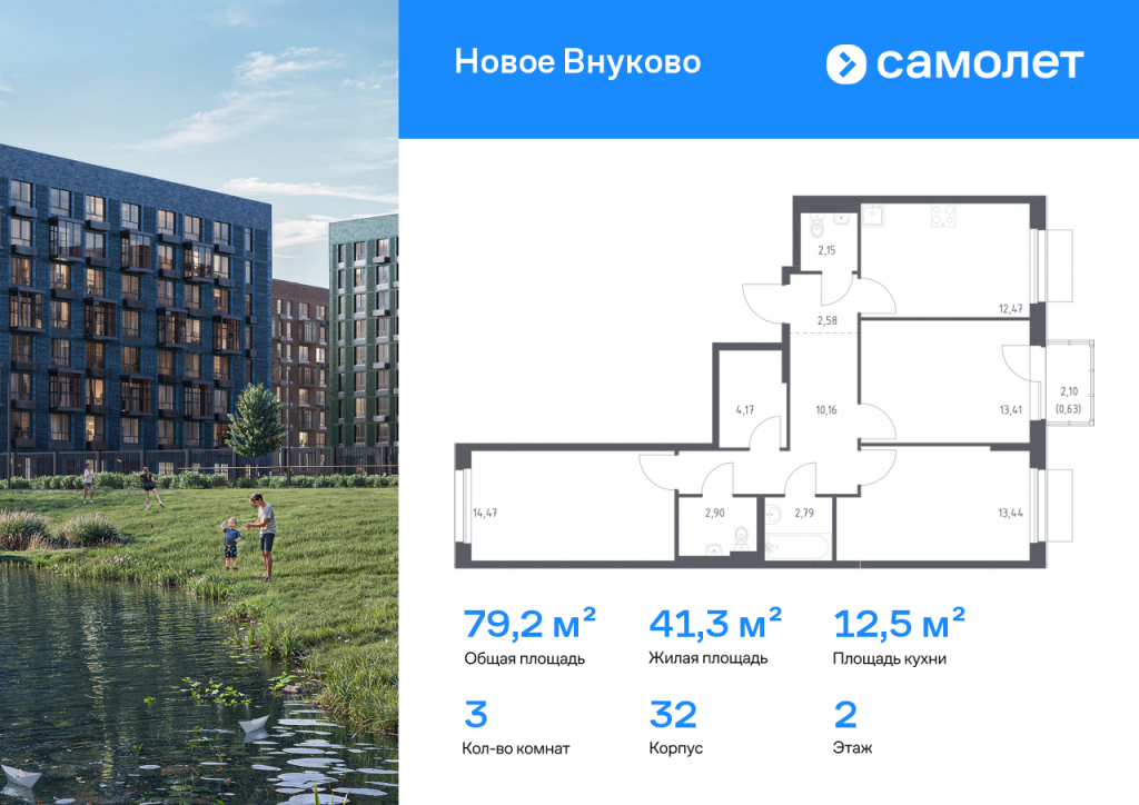 Строим кварталы для жизни с заботой о будущем. Предлагается 3-комнатная квартира комфорт-класса 79,17 кв.м в корпусе 32 на 2 этаже, в ЖК «Новое Внуково» Квартира с чистовой отделкой. Доступность дополнительных опций уточняйте у застройщика. Приобрести квартиру возможно по специальным акциям от застройщика, с текущими условиями акций можно ознакомиться в блоке «Акций». Цена динамическая и может отличаться, уточняйте актуальность у застройщика. «Новое Внуково» — это жилой комплекс в Новой Москве, у подножия берега реки Незнайка. Поблизости — живописные места для прогулок: народный парк «Ручеек», усадьба Старо-Никольское, Валуевский и Ульяновский лесопарки. Часть домов сдана и внутри района уже открыт детсад с бассейном, а в ближайшее время откроются еще 3 детсада, 2 школы и поликлиника. На территории проекта будет построен первый в России Центр Российской Федерации Баскетбола, где будут площадки с трибунами, тренажерный зал, кафе и конференц-зал. Дворы-парки закрыты от машин и посторонних. На территории — прогулочный маршрут вдоль реки Незнайка и набережная с шезлонгами и качелями для отдыха. Также здесь появится плейхаб «Незнайка на Луне», площадь для мероприятий с сухим фонтаном, летним кинотеатром и кафе. В жилом комплексе — монолитные дома высотой от 6 до 14 этажей. Фасады облицованы кирпичом природных оттенков.