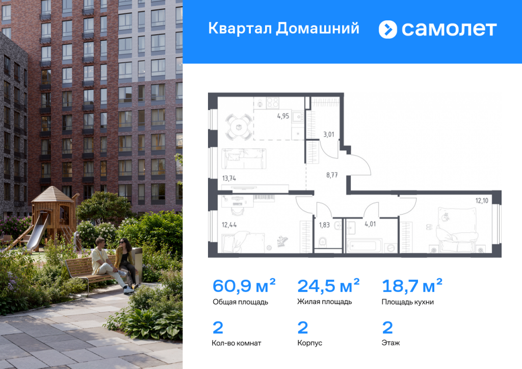 Строим кварталы для жизни с заботой о будущем. Предлагается 2-комнатная квартира комфорт-класса 60,85 кв.м в корпусе 2 на 2 этаже, в ЖК «Квартал Домашний» Квартира с чистовой отделкой. Доступность дополнительных опций уточняйте у застройщика. Приобрести квартиру возможно по специальным акциям от застройщика, с текущими условиями акций можно ознакомиться в блоке «Акций». Цена динамическая и может отличаться, уточняйте актуальность у застройщика. «Квартал Домашний» находится в Марьино — всего 7 минут пешком до МЦД-2 «Курьяново». Рядом с домом — набережная Москвы-реки. Внутренняя инфраструктура проекта продумана до мелочей: от супермаркетов до кафе и салонов красоты. В «Квартале Домашнем» можно выбирать свою высоту — в комплексе есть корпуса от 7 до 19 этажей. Среди планировочных решений — просторные кухни-гостиные, гардеробные, постирочные, лоджии и угловые окна. «Квартал Домашний» — это: 1. До станции МЦД-2 «Курьяново» — 7 минут пешком 2. До парка 850-летия Москвы — 5 минут пешком 3. До парка «Борисовские пруды» — 15 минут на машине 4. До музея-заповедника «Царицыно» — 20 минут на авто 5. Музей-заповедник «Коломенское» — для фотосессий и прогулок 6. Европейская архитектура с фасадами природных оттенков: песочного, серого, зеленого, терракотового 7. Школа со стадионом, 2 детских сада — на территории квартала 8. Магазины, кафе и салоны красоты на первых этажах домов 9. Приватные дворы без машин 10. Подземный паркинг с местами для электрокаров и индивидуальные кладовые 11. Спортивные и игровые площадки