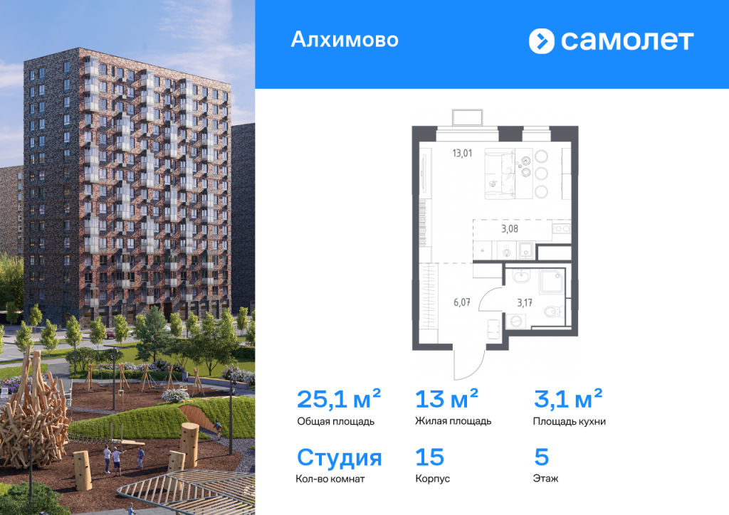 Строим кварталы для жизни с заботой о будущем. Предлагается квартира студия комфорт-класса 25,1 кв.м в корпусе 15 на 5 этаже, в ЖК «Алхимово» Квартира с чистовой отделкой. Доступность дополнительных опций уточняйте у застройщика. Приобрести квартиру возможно по специальным акциям от застройщика, с текущими условиями акций можно ознакомиться в блоке «Акций». Цена динамическая и может отличаться, уточняйте актуальность у застройщика. «Алхимово» — жилой комплекс в Новой Москве, в 16 км от МКАД. Рядом — живописный Дубровицкий лесопарк и река Десна. На территории уже есть свои школа и детский сад, ведется строительство еще одного детского сада. Супермаркеты, аптеки и кафе — в паре шагов от дома. В будущем появится свой торговый центр. В квартале есть воркаут-зона, игровые площадки, отдельная площадка для выгула собак. Дворы закрыты от машин, для автомобилистов предусмотрен многоуровневый паркинг. В проекте — монолитные дома высотой от 8 до 16 этажей. Фасады облицованы декоративным кирпичом естественных оттенков.