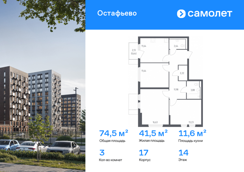 Строим кварталы для жизни с заботой о будущем. Предлагается 3-комнатная квартира комфорт-класса 74,5 кв.м в корпусе 17 на 14 этаже, в ЖК «Остафьево» Квартира с чистовой отделкой. Доступность дополнительных опций уточняйте у застройщика. Приобрести квартиру возможно по специальным акциям от застройщика, с текущими условиями акций можно ознакомиться в блоке «Акций». Цена динамическая и может отличаться, уточняйте актуальность у застройщика. «Остафьево» — масштабный жилой комплекс в Новой Москве, рядом с одноименным музеем-усадьбой и городским парком «Барыши». До станций МЦД «Щербинка» и «Остафьево» можно добраться на автомобиле за 5–7 минут. Часть домов уже сдана, на территории открыты две школы и три детских сада, а в будущем будет построена поликлиника, ТЦ, еще одна школа и три детских сада. Все необходимое рядом: на первых этажах домов работают магазины, аптеки и кафе. Дворы — приватные мини-парки без машин и посторонних. Кроме игровых площадок, для детей обустроили тематический плейхаб «Маяк». В будущем появятся плейхаб «Алиса в стране чудес», арт-объект «Тропа зеркал», а также большой ландшафтный парк. В квартале — монолитные дома комфортной высоты, от 10 этажей. Светлые фасады украшают кирпичные вставки в теплых природных оттенках.