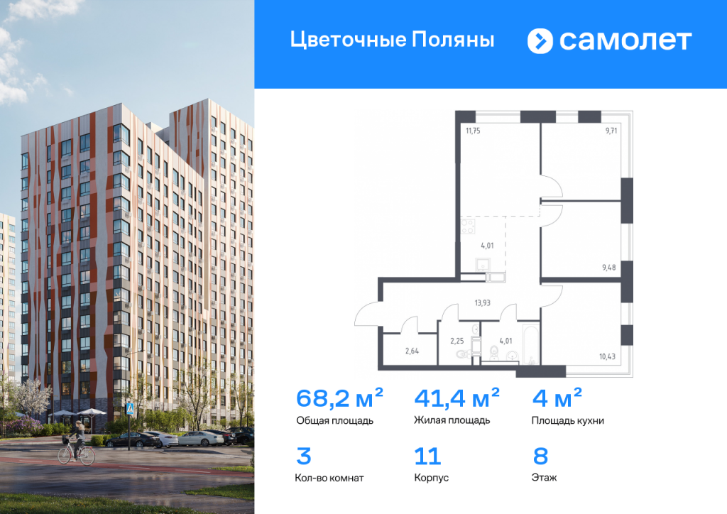 Строим кварталы для жизни с заботой о будущем. Предлагается 3-комнатная квартира комфорт-класса 68,21 кв.м в корпусе 11 на 8 этаже, в ЖК «Цветочные Поляны» Квартира без отделки. Доступность опции «отделка» и возможность комплектации мебелью и декором уточняйте у застройщика. Приобрести квартиру возможно по специальным акциям от застройщика, с текущими условиями акций можно ознакомиться в блоке «Акций». Цена динамическая и может отличаться, уточняйте актуальность у застройщика. «Цветочные Поляны» — жилой комплекс в Новой Москве, рядом с Валуевским и Ульяновским лесопарками. В квартале есть лесопарковая зона площадью 5 гектаров, где можно заниматься спортом, кататься на велосипеде и просто гулять среди деревьев. Также в пешей доступности — Валуевский лесопарк, дойти до которого можно вдоль «берега» декоративного сухого ручья. Те, кто любит отдых у воды, всегда могут прогуляться до реки Незнайки. В «Цветочных Полянах» предусмотрена образовательная инфраструктура для семей с детьми: уже построены первая школа и детский сад, в планах — строительство еще двух детских садов и второй школы. В квартале уже работают супермаркеты, кафе, салоны красоты, а в будущем появится свой торговый центр. Дома высотой до 22 этажей построены по монолитной технологии. Рисунок на фасадах отсылает к традиционному искусству Староселья — плетению кружев из стекляруса.