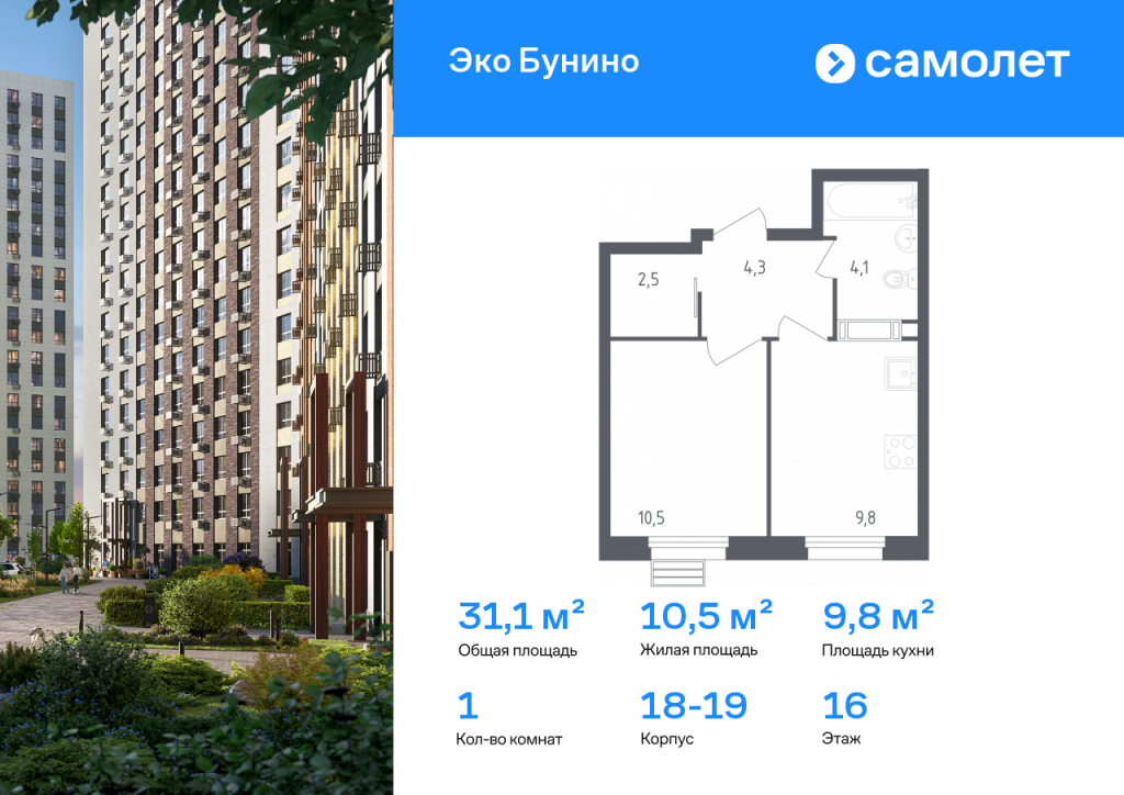 Строим кварталы для жизни с заботой о будущем. Предлагается 1-комнатная квартира комфорт-класса 31,1 кв.м в корпусе 18-19 на 16 этаже, в ЖК «Эко Бунино» Квартира без отделки. Доступность опции «отделка» и возможность комплектации мебелью и декором уточняйте у застройщика. Приобрести квартиру возможно по специальным акциям от застройщика, с текущими условиями акций можно ознакомиться в блоке «Акций». Цена динамическая и может отличаться, уточняйте актуальность у застройщика. «Эко Бунино» — жилой комплекс в Новой Москве, полностью готовый для жизни. Уже построены школа и детские сады, открыты ледовая арена и магазины. Рядом — 2 станции метро и 3 лесопарка для прогулок. До станции метро «Новомосковская» — 20 минут пешком по экотропе. Во дворах-парках, закрытых от машин, комфортно и безопасно гулять. Здесь высажены уже взрослые деревья, которые создают прохладную тень в жаркий день. Ребенок любого возраста найдет увлекательное занятие в уже готовом плейхабе с большой горкой в виде слона и уникальным игровым оборудованием. Пока дети играют, родители могут прогуляться по бульвару или отдохнуть под навесом из растений. «Эко Бунино» — это 19 монолитных домов переменной этажности. Для облицовки используется навесной вентилируемый фасад и клинкерная плитка, которая имитирует кирпич. Переменная этажность обеспечивает хорошую инсоляцию дворов: в солнечные дни на территории особенно приятно гулять.